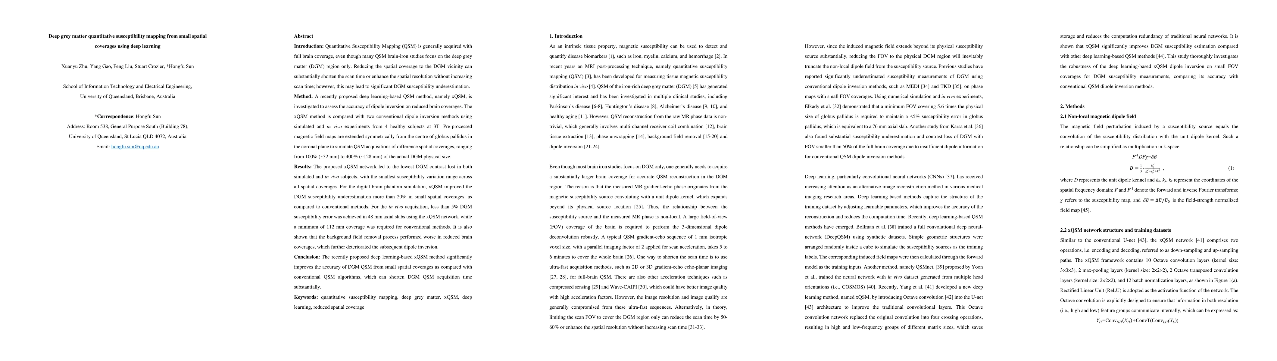 A new deep learning method improves the accuracy of quantitative susceptibility mapping in deep grey matter from reduced spatial coverages, potentially shortening acquisition times.