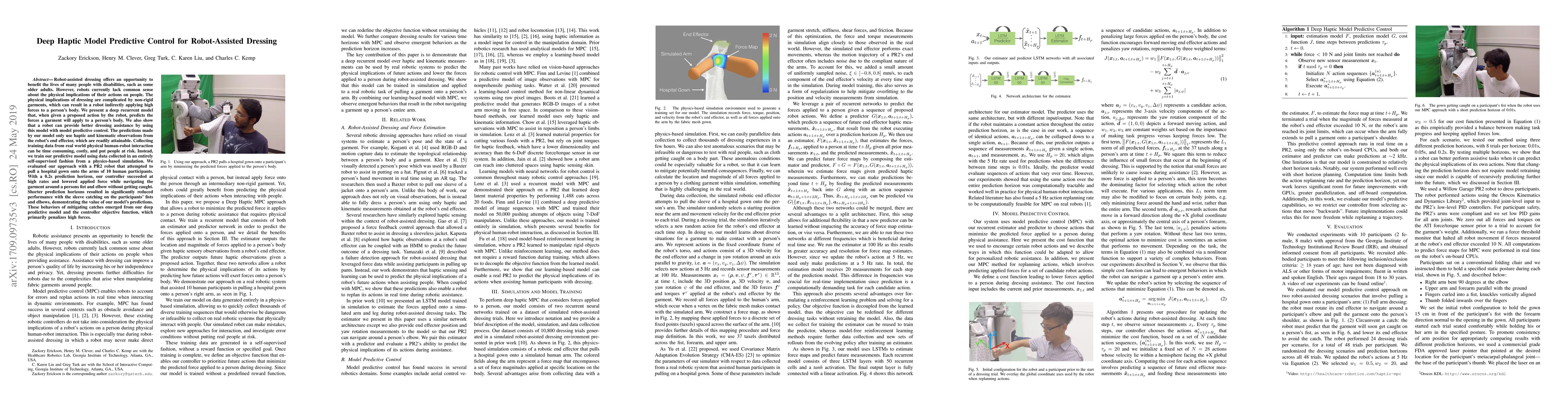 This work stands out by combining deep learning with model predictive control in a haptic-only setting, training the model using self-supervised data from a physics-based simulation, and demonstrating successful application in real-world robot-assisted dressing tasks.