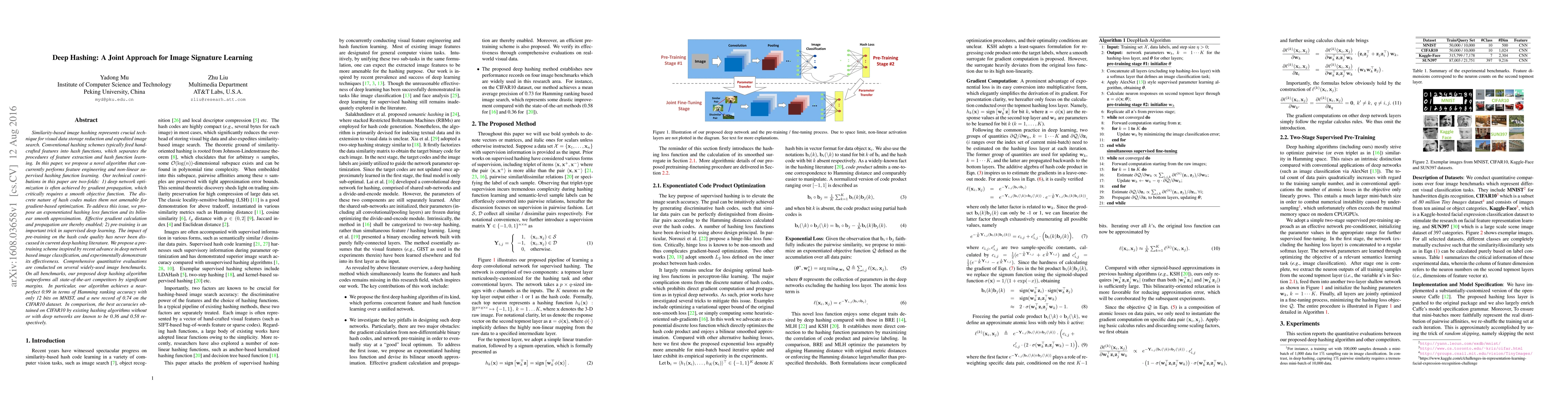 Similarity-based image hashing represents crucial technique for visual data storage reduction and expedited image search. Conventional hashing schemes typically feed hand-crafted features into hash functions, which separates the procedures of feature extraction and hash function learning. In this paper, we propose a novel algorithm that concurrently performs feature engineering and non-linear supervised hashing function learning. Our technical contributions in this paper are two-folds: 1) deep network optimization is often achieved by gradient propagation, which critically requires a smooth objective function. The discrete nature of hash codes makes them not amenable for gradient-based optimization. To address this issue, we propose an exponentiated hashing loss function and its bilinear smooth approximation. Effective gradient calculation and propagation are thereby enabled; 2) pre-training is an important trick in supervised deep learning. The impact of pre-training on the hash code quality has never been discussed in current deep hashing literature. We propose a pre-training scheme inspired by recent advance in deep network based image classification, and experimentally demonstrate its effectiveness. Comprehensive quantitative evaluations are conducted on several widely-used image benchmarks. On all benchmarks, our proposed deep hashing algorithm outperforms all state-of-the-art competitors by significant margins. In particular, our algorithm achieves a near-perfect 0.99 in terms of Hamming ranking accuracy with only 12 bits on MNIST, and a new record of 0.74 on the CIFAR10 dataset. In comparison, the best accuracies obtained on CIFAR10 by existing hashing algorithms without or with deep networks are known to be 0.36 and 0.58 respectively.