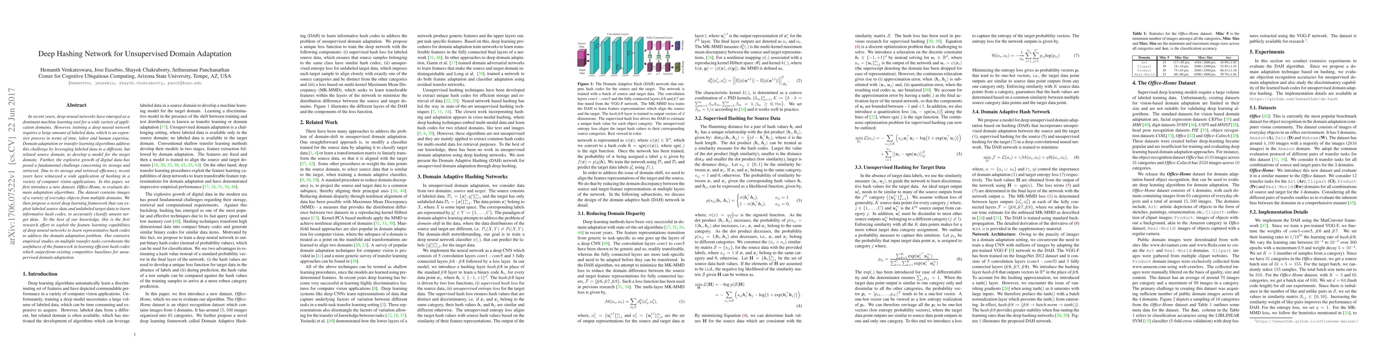 This paper introduces a novel deep hashing network for unsupervised domain adaptation, leveraging the Office-Home dataset to evaluate its effectiveness. The proposed framework learns efficient hash codes from labeled source and unlabeled target data, outperforming existing methods in transfer tasks.