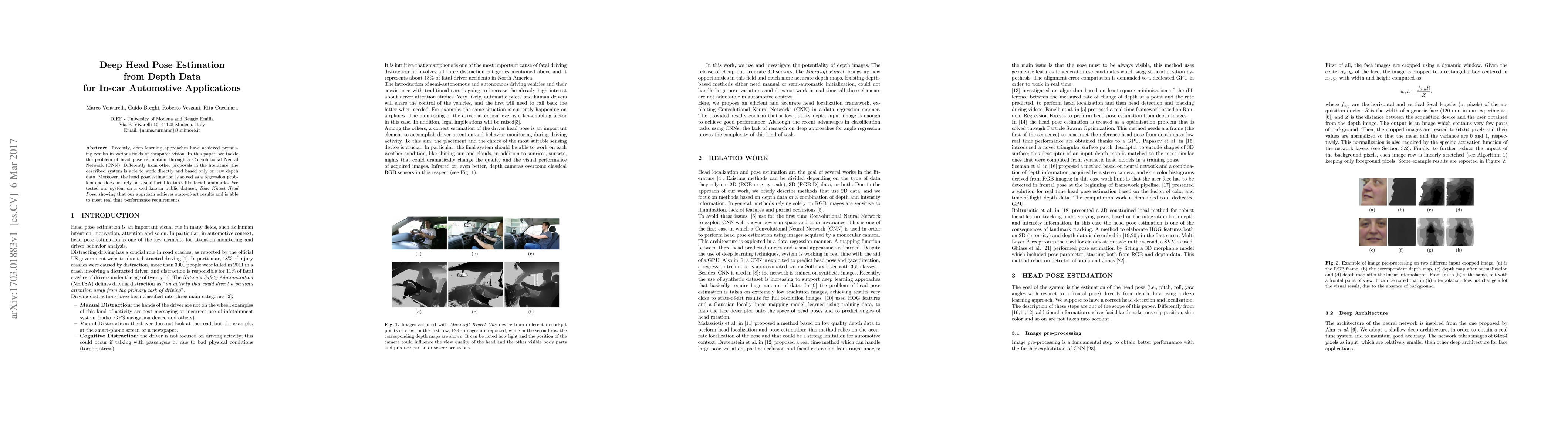 This paper proposes a deep learning-based Convolutional Neural Network (CNN) for head pose estimation directly from raw depth data, achieving state-of-the-art results on the Biwi Kinect Head Pose dataset without relying on visual facial features. The method meets real-time performance requirements for in-car automotive applications.