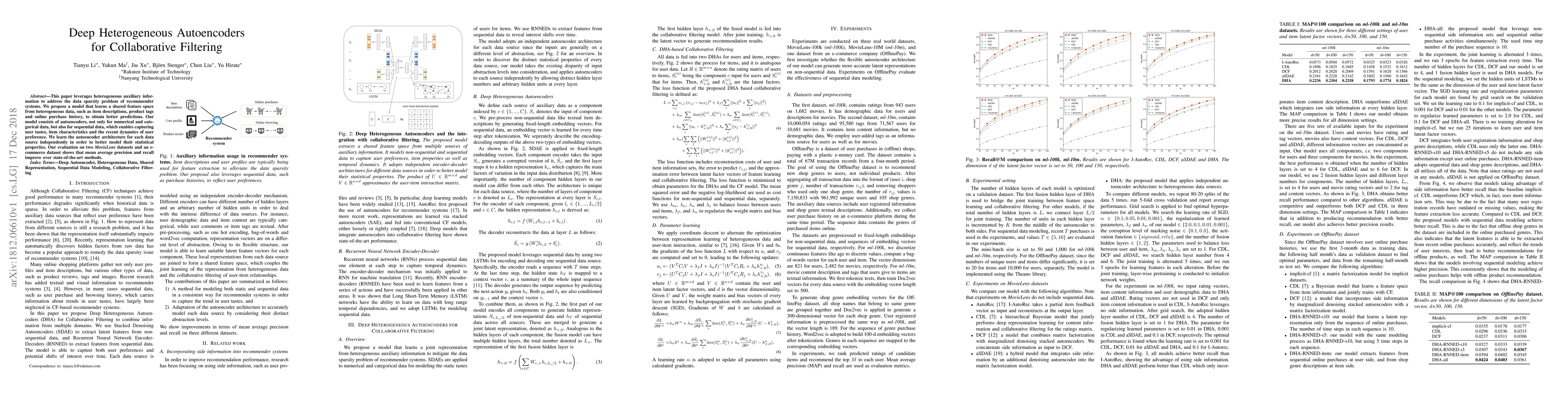 This paper leverages heterogeneous auxiliary information to address the data sparsity problem of recommender systems. We propose a model that learns a shared feature space from heterogeneous data, such as item descriptions, product tags and online purchase history, to obtain better predictions. Our model consists of autoencoders, not only for numerical and categorical data, but also for sequential data, which enables capturing user tastes, item characteristics and the recent dynamics of user preference. We learn the autoencoder architecture for each data source independently in order to better model their statistical properties. Our evaluation on two MovieLens datasets and an e-commerce dataset shows that mean average precision and recall improve over state-of-the-art methods.