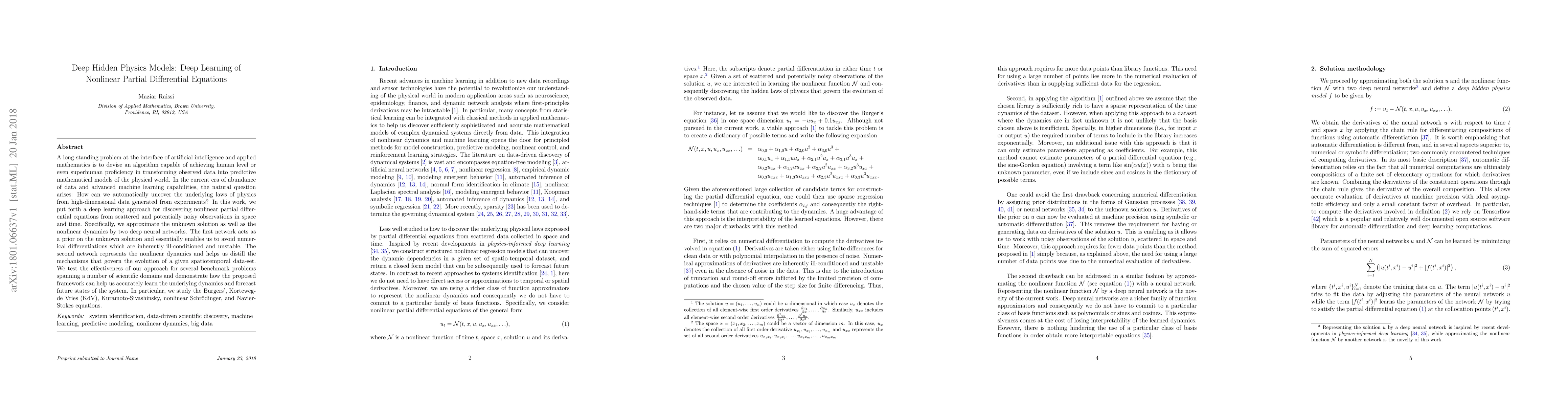 A long-standing problem at the interface of artificial intelligence and applied mathematics is to devise an algorithm capable of achieving human level or even superhuman proficiency in transforming observed data into predictive mathematical models of the physical world. In the current era of abundance of data and advanced machine learning capabilities, the natural question arises: How can we automatically uncover the underlying laws of physics from high-dimensional data generated from experiments? In this work, we put forth a deep learning approach for discovering nonlinear partial differential equations from scattered and potentially noisy observations in space and time. Specifically, we approximate the unknown solution as well as the nonlinear dynamics by two deep neural networks. The first network acts as a prior on the unknown solution and essentially enables us to avoid numerical differentiations which are inherently ill-conditioned and unstable. The second network represents the nonlinear dynamics and helps us distill the mechanisms that govern the evolution of a given spatiotemporal data-set. We test the effectiveness of our approach for several benchmark problems spanning a number of scientific domains and demonstrate how the proposed framework can help us accurately learn the underlying dynamics and forecast future states of the system. In particular, we study the Burgers', Korteweg-de Vries (KdV), Kuramoto-Sivashinsky, nonlinear Schr\"{o}dinger, and Navier-Stokes equations.