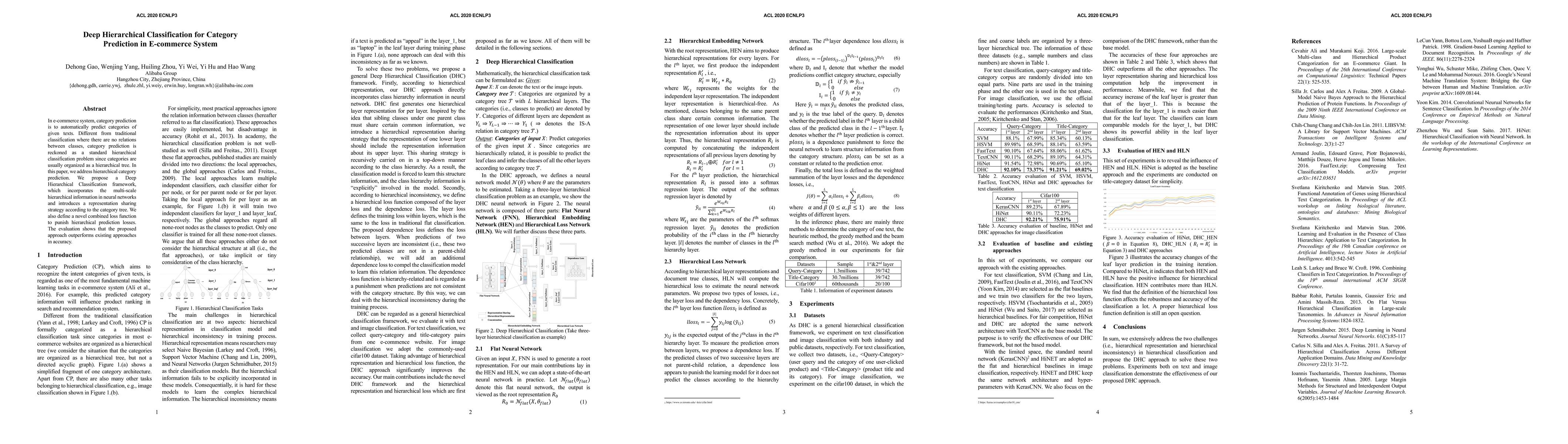 This paper proposes a Deep Hierarchical Classification framework for predicting categories in e-commerce, leveraging multi-scale hierarchical information and representation sharing. The framework uses a novel combined loss function to enhance hierarchical prediction accuracy, outperforming existing methods.