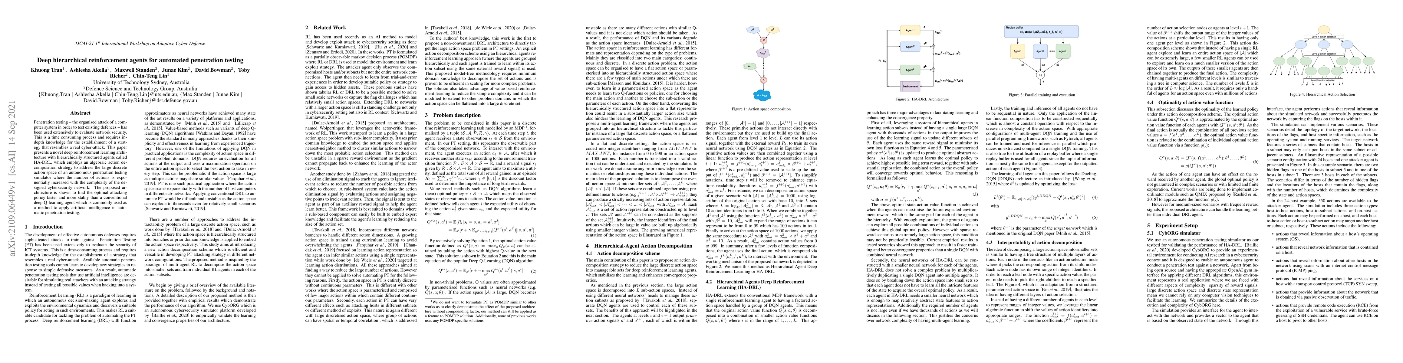This paper introduces HA-DRL, a novel deep reinforcement learning architecture with hierarchically structured agents, to automate penetration testing. The proposed method uses an algebraic action decomposition to efficiently navigate the large discrete action space, achieving faster and more stable optimal attacking policy discovery compared to conventional deep Q-learning.