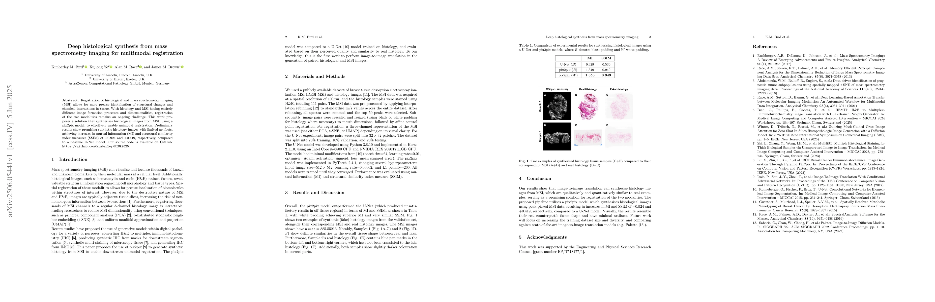 This work stands out by proposing a deep learning-based approach to synthesize histological images from MSI data, surpassing a baseline U-Net model in registration performance metrics.