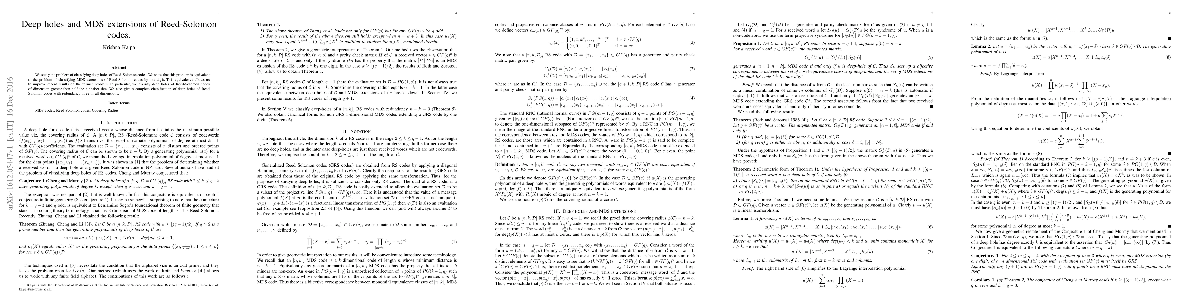 This paper classifies deep holes in Reed-Solomon codes, demonstrating their equivalence to MDS extensions by one digit, which leads to improved results. It provides a complete classification of deep holes for codes with redundancy three and dimension greater than half the alphabet size.