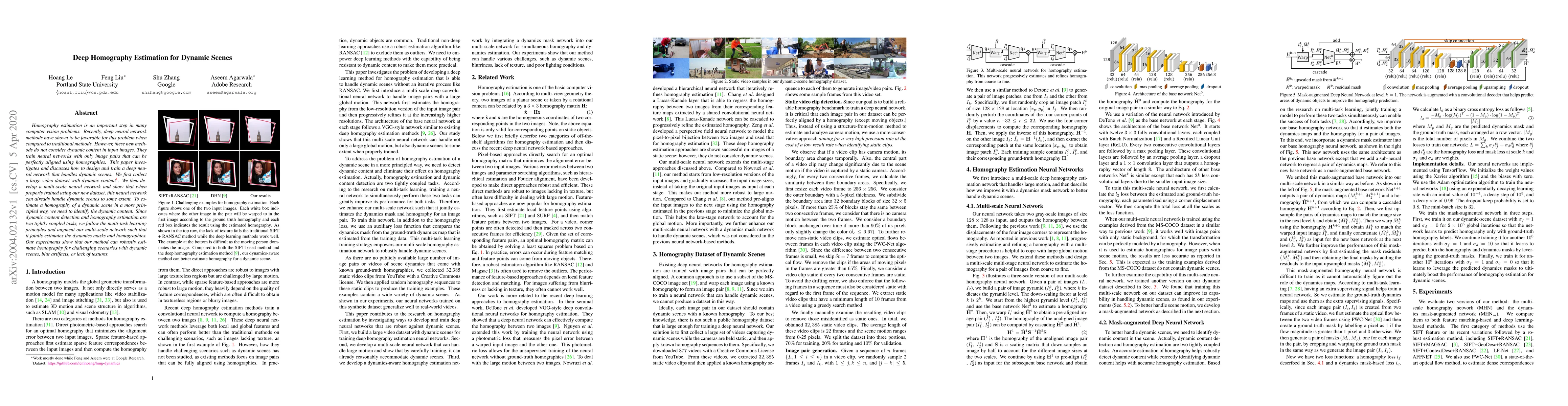 This paper proposes a deep neural network for homography estimation in dynamic scenes, addressing the limitation of existing methods that ignore dynamic content. It introduces a multi-scale network trained on a large video dataset to handle dynamic scenes and employs multi-task learning to jointly estimate dynamic masks and homographies, achieving robust performance in challenging scenarios.