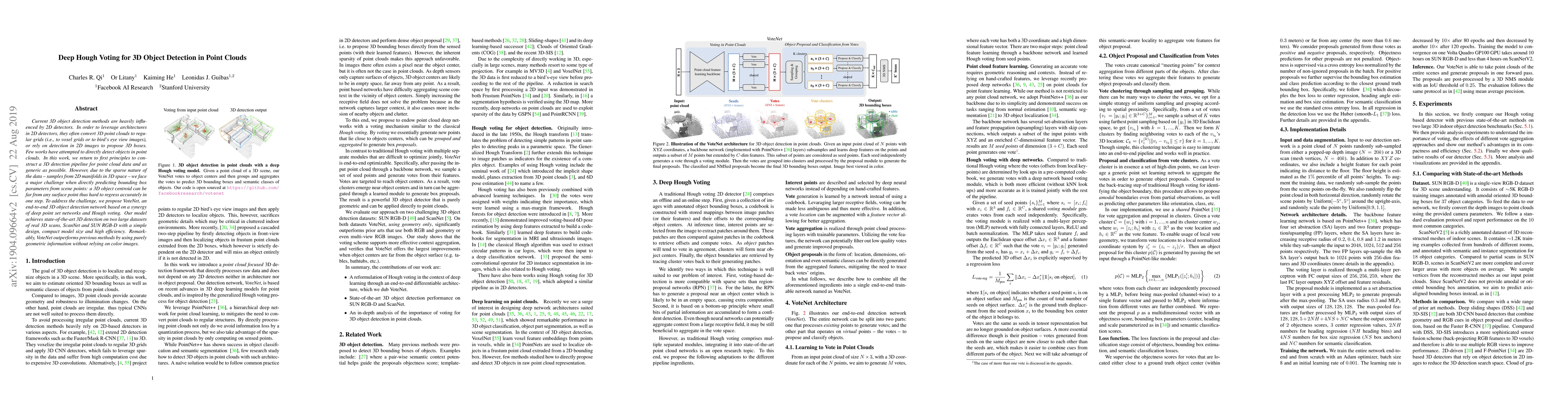 VoteNet proposes a novel deep learning framework, combining deep point set networks and Hough voting, for direct 3D object detection in point clouds. It achieves state-of-the-art performance on ScanNet and SUN RGB-D datasets using only geometric information, without relying on color images.