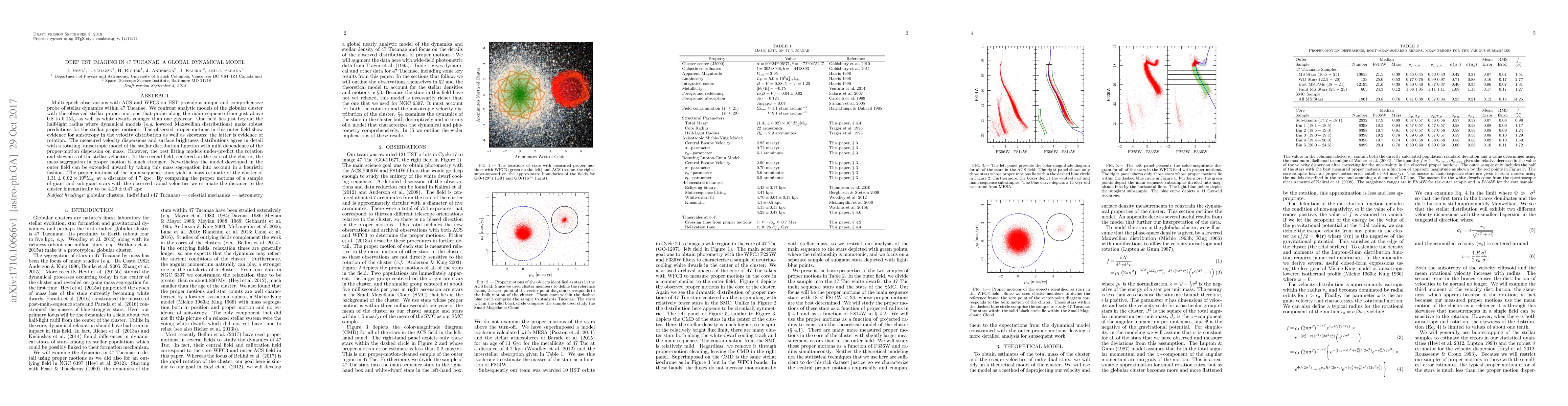 Multi-epoch observations with ACS and WFC3 on HST provide a unique and comprehensive probe of stellar dynamics within 47 Tucanae. We confront analytic models of the globular cluster with the observed stellar proper motions that probe along the main sequence from just above 0.8 to 0.1M$_\odot$ as well as white dwarfs younger than one gigayear. One field lies just beyond the half-light radius where dynamical models (\eg lowered Maxwellian distributions) make robust predictions for the stellar proper motions. The observed proper motions in this outer field show evidence for anisotropy in the velocity distribution as well as skewness; the latter is evidence of rotation. The measured velocity dispersions and surface brightness distributions agree in detail with a rotating, anisotropic model of the stellar distribution function with mild dependence of the proper-motion dispersion on mass. However, the best fitting models under-predict the rotation and skewness of the stellar velocities. In the second field, centered on the core of the cluster, the mass segregation in proper motion is much stronger. Nevertheless the model developed in the outer field can be extended inward by taking this mass segregation into account in a heuristic fashion. The proper motions of the main-sequence stars yield a mass estimate of the cluster of $1.31 \pm 0.02 \times 10^6 \mathrm{M}_\odot$ at a distance of 4.7 kpc. By comparing the proper motions of a sample of giant and sub-giant stars with the observed radial velocities we estimate the distance to the cluster kinematically to be $4.29 \pm 0.47$ kpc.