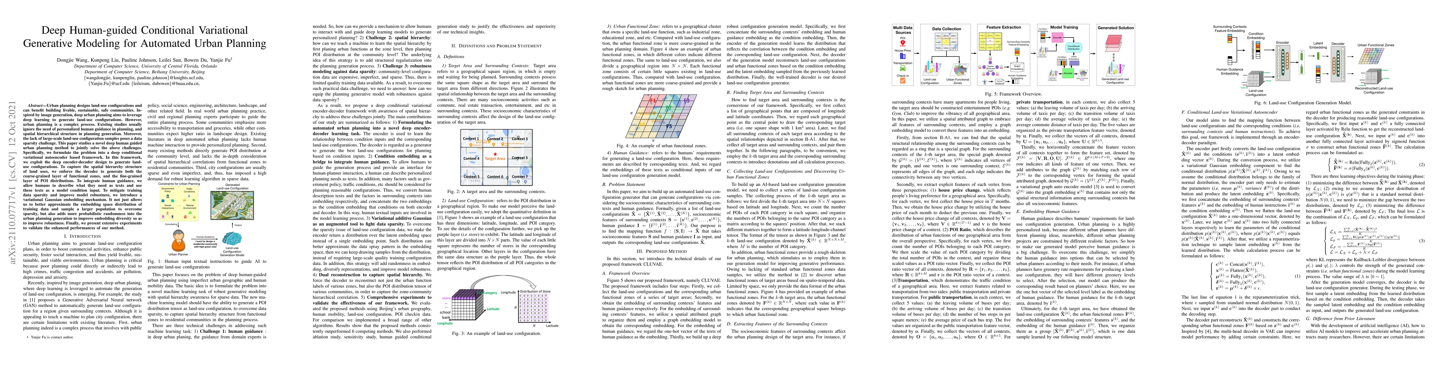 This paper proposes a deep human-guided conditional variational autoencoder framework for automated urban planning, addressing the need for personalized human guidance and spatial hierarchical structures in land-use configurations. It integrates human input via text descriptions and uses a variational Gaussian embedding to mitigate data sparsity and enhance model robustness.
