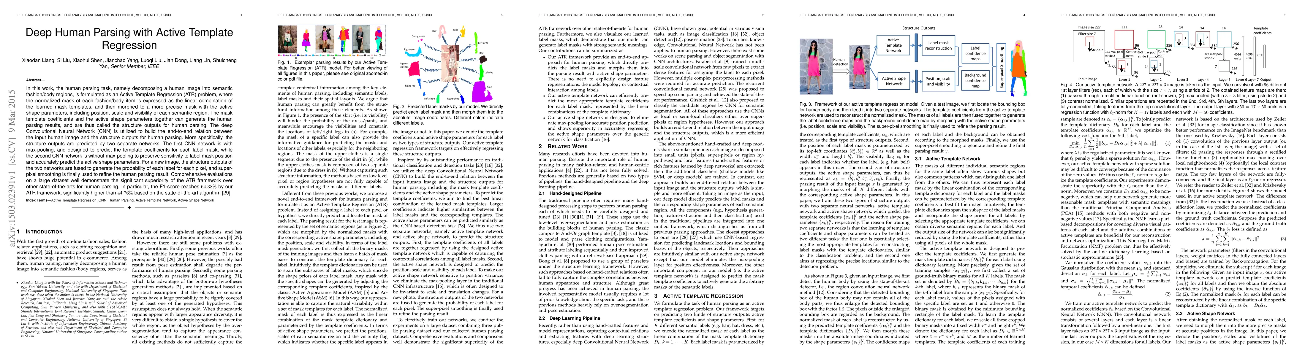 This research proposes a Deep Human Parsing method using Active Template Regression (ATR). It decomposes human images into semantic regions using learned mask templates, refined with active shape parameters. Two CNN networks predict template coefficients and active shape parameters respectively, then fuse to generate parsing results. Evaluations show significant improvement over existing methods, achieving a 64.38% F1-score, notably higher than the previous best of 44.76%.