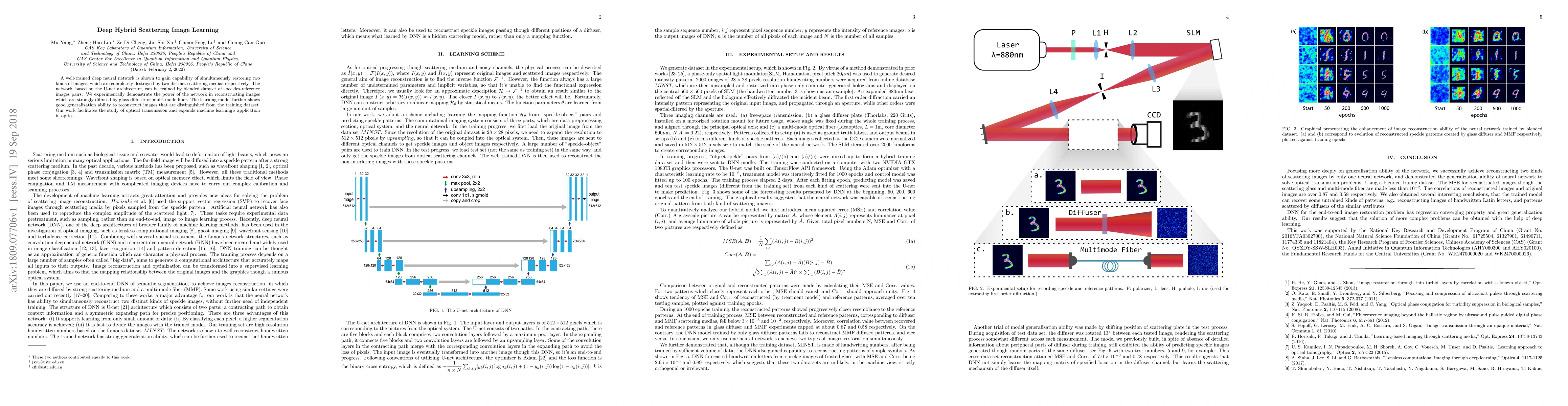 A well-trained deep neural network is shown to gain capability of simultaneously restoring two kinds of images, which are completely destroyed by two distinct scattering medias respectively. The network, based on the U-net architecture, can be trained by blended dataset of speckles-reference images pairs. We experimentally demonstrate the power of the network in reconstructing images which are strongly diffused by glass diffuser or multi-mode fiber. The learning model further shows good generalization ability to reconstruct images that are distinguished from the training dataset. Our work facilitates the study of optical transmission and expands machine learning's application in optics.