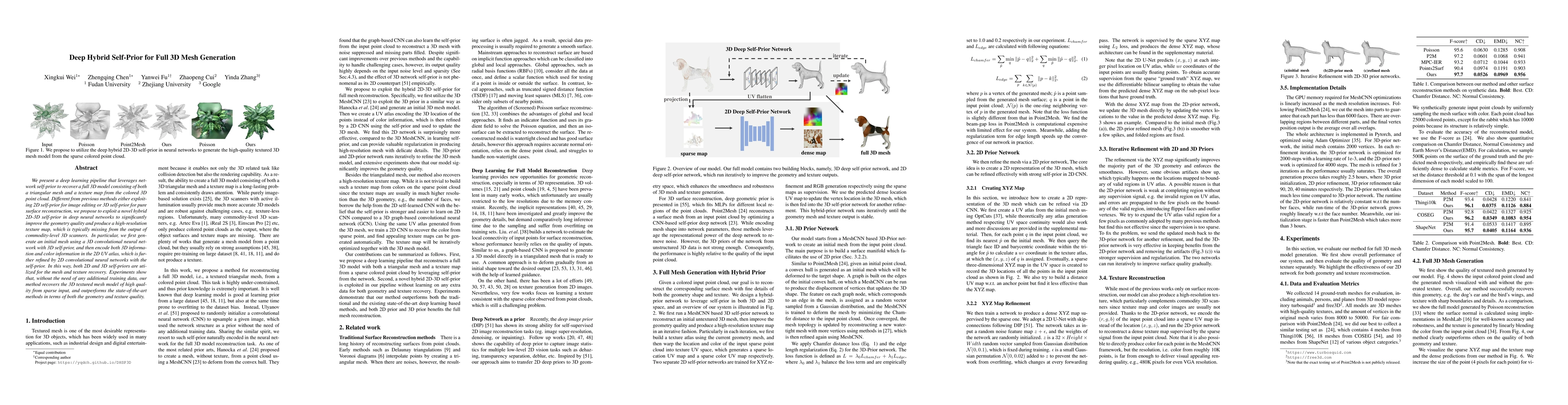 This paper proposes a deep learning method that uses a hybrid 2D-3D self-prior to generate high-quality 3D textured mesh models from sparse 3D point clouds. The approach combines 3D and 2D convolutional networks to improve both geometry and texture recovery, outperforming existing state-of-the-art methods.