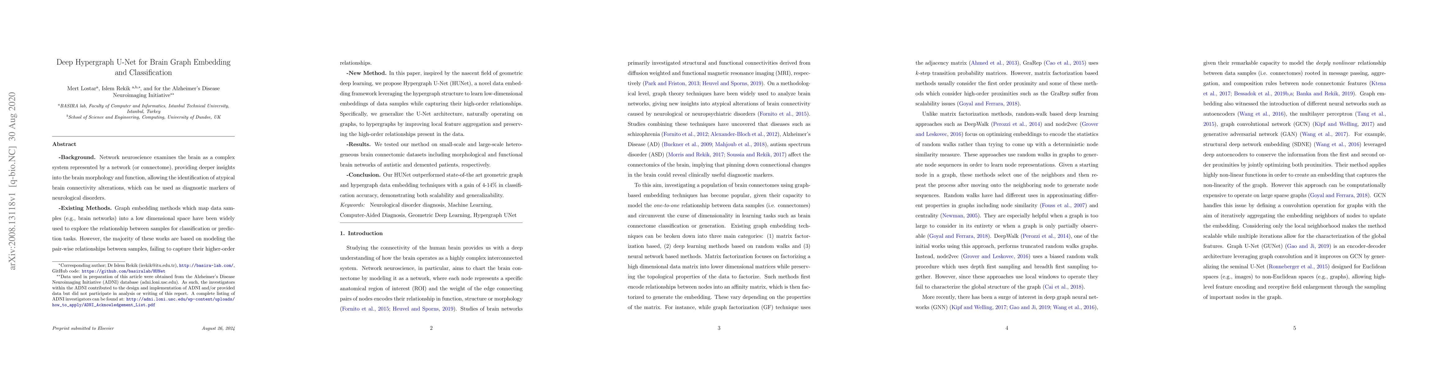 -Background. Network neuroscience examines the brain as a complex system represented by a network (or connectome), providing deeper insights into the brain morphology and function, allowing the identification of atypical brain connectivity alterations, which can be used as diagnostic markers of neurological disorders. -Existing Methods. Graph embedding methods which map data samples (e.g., brain networks) into a low dimensional space have been widely used to explore the relationship between samples for classification or prediction tasks. However, the majority of these works are based on modeling the pair-wise relationships between samples, failing to capture their higher-order relationships. -New Method. In this paper, inspired by the nascent field of geometric deep learning, we propose Hypergraph U-Net (HUNet), a novel data embedding framework leveraging the hypergraph structure to learn low-dimensional embeddings of data samples while capturing their high-order relationships. Specifically, we generalize the U-Net architecture, naturally operating on graphs, to hypergraphs by improving local feature aggregation and preserving the high-order relationships present in the data. -Results. We tested our method on small-scale and large-scale heterogeneous brain connectomic datasets including morphological and functional brain networks of autistic and demented patients, respectively. -Conclusion. Our HUNet outperformed state-of-the-art geometric graph and hypergraph data embedding techniques with a gain of 4-14% in classification accuracy, demonstrating both scalability and generalizability. HUNet code is available at https://github.com/basiralab/HUNet.