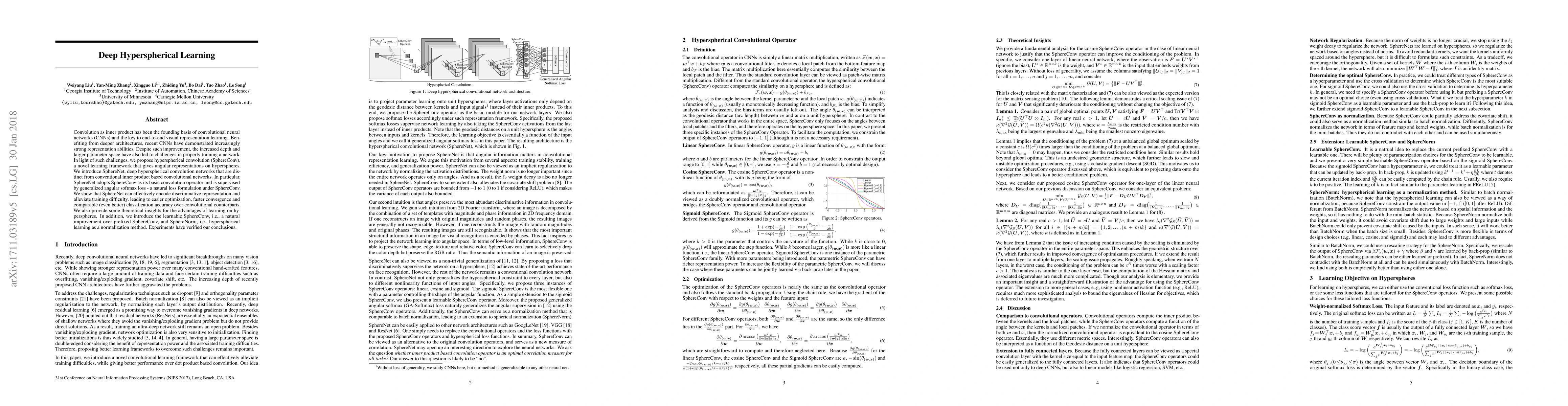 The paper proposes hyperspherical convolution (SphereConv) as a novel framework for deep learning, introducing SphereNet that leverages angular representations on hyperspheres to encode discriminative features. SphereNet demonstrates easier optimization, faster convergence, and comparable or better classification accuracy compared to conventional CNNs, supported by theoretical insights and experimental validation.