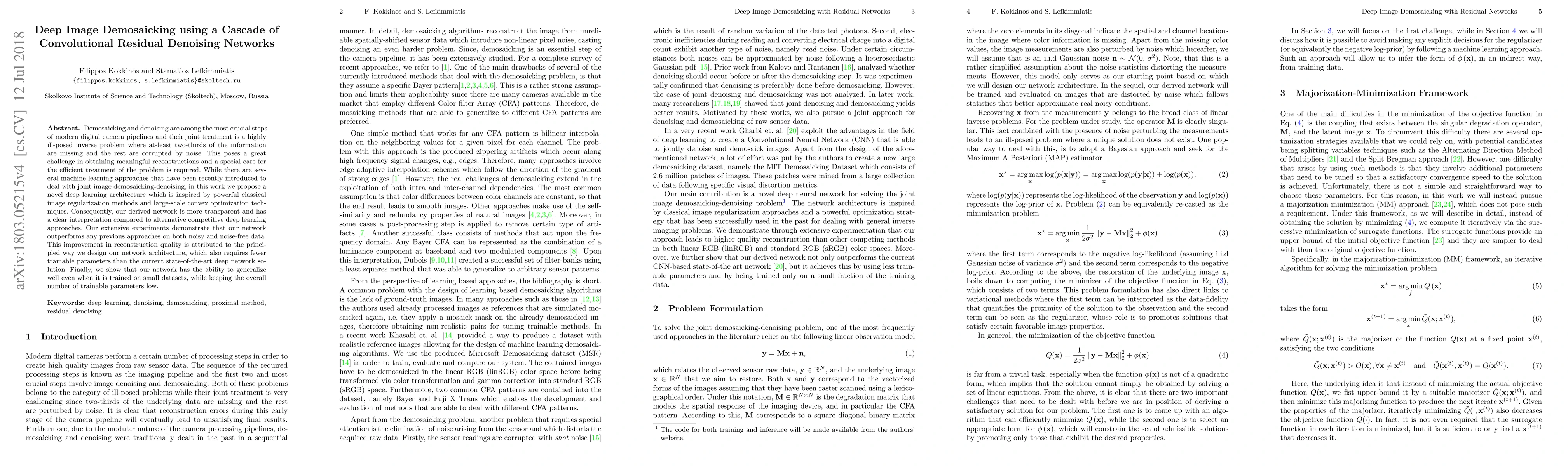 This paper proposes a novel deep learning architecture for joint image demosaicking and denoising, utilizing a cascade of convolutional residual denoising networks. The proposed method outperforms existing approaches in reconstruction quality, requires fewer parameters, and generalizes well even with limited training data.