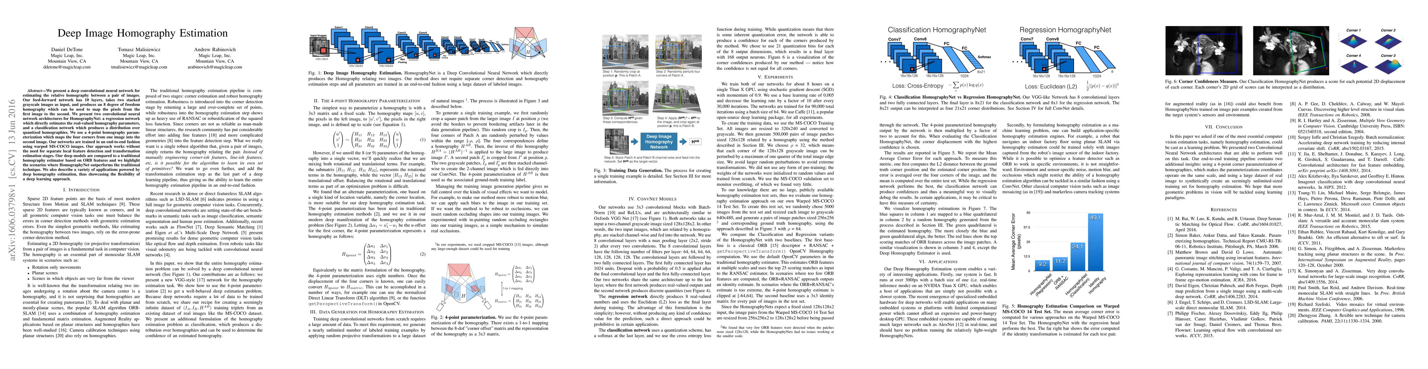 This paper presents a deep convolutional neural network for estimating image homography using two input grayscale images, directly mapping pixels between them. It compares two network architectures—one for regression and one for classification—and demonstrates superior performance over traditional ORB-based methods in various applications.