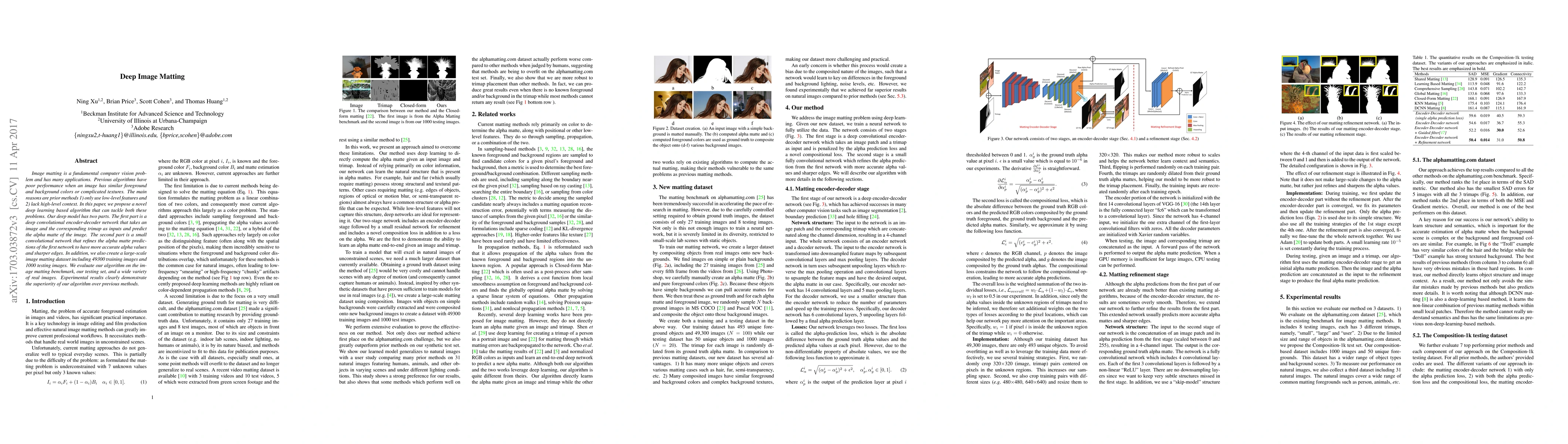 This paper introduces a deep learning-based algorithm for image matting that addresses the limitations of prior methods by using both low-level features and high-level context. The proposed model consists of a convolutional encoder-decoder network and a refinement network, and it is evaluated on a new large-scale dataset, demonstrating superior performance over existing techniques.