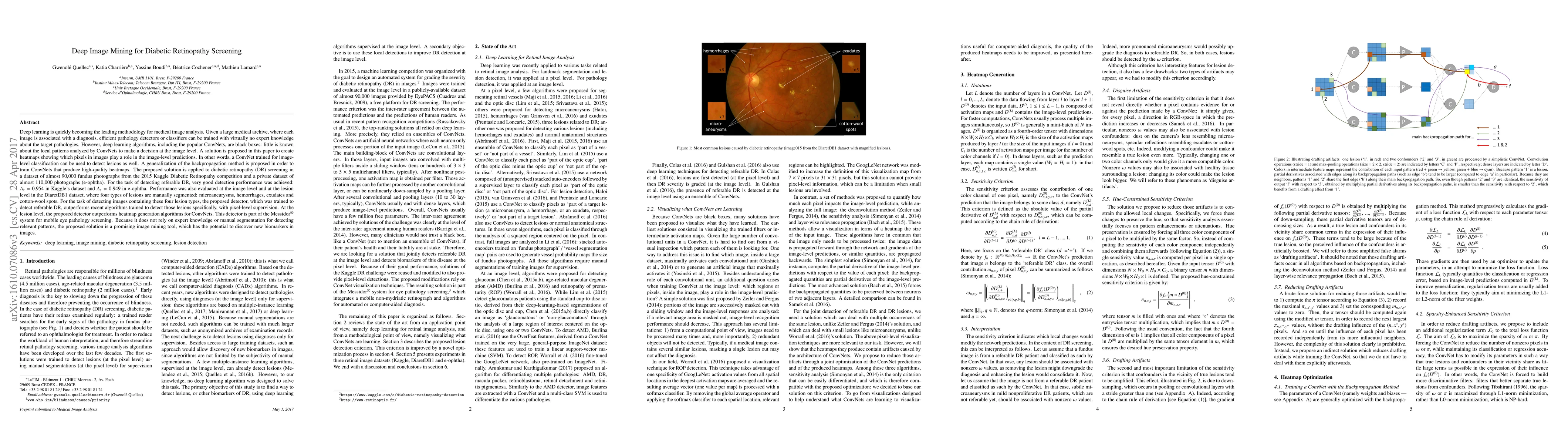 This paper proposes a deep learning method to screen for diabetic retinopathy using convolutional neural networks (ConvNets) that generate heatmaps to identify relevant image pixels for diagnosis. The method achieves high detection performance for referable DR and outperforms existing lesion-specific detectors, demonstrating its potential as a valuable tool for discovering new biomarkers in medical imaging.