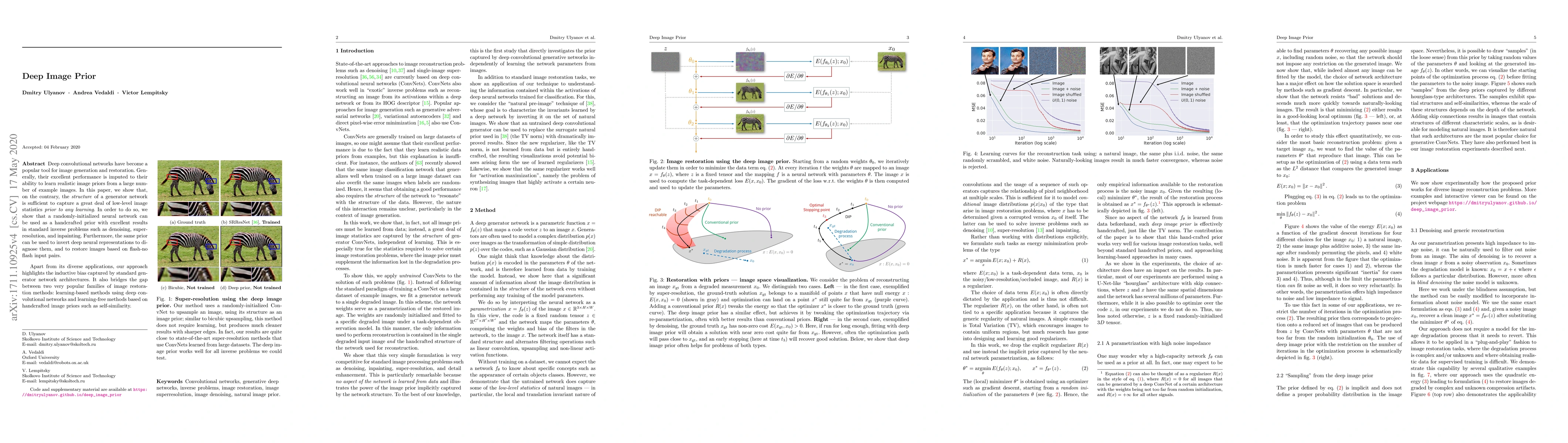Deep convolutional networks have become a popular tool for image generation and restoration. Generally, their excellent performance is imputed to their ability to learn realistic image priors from a large number of example images. In this paper, we show that, on the contrary, the structure of a generator network is sufficient to capture a great deal of low-level image statistics prior to any learning. In order to do so, we show that a randomly-initialized neural network can be used as a handcrafted prior with excellent results in standard inverse problems such as denoising, super-resolution, and inpainting. Furthermore, the same prior can be used to invert deep neural representations to diagnose them, and to restore images based on flash-no flash input pairs. Apart from its diverse applications, our approach highlights the inductive bias captured by standard generator network architectures. It also bridges the gap between two very popular families of image restoration methods: learning-based methods using deep convolutional networks and learning-free methods based on handcrafted image priors such as self-similarity. Code and supplementary material are available at https://dmitryulyanov.github.io/deep_image_prior .