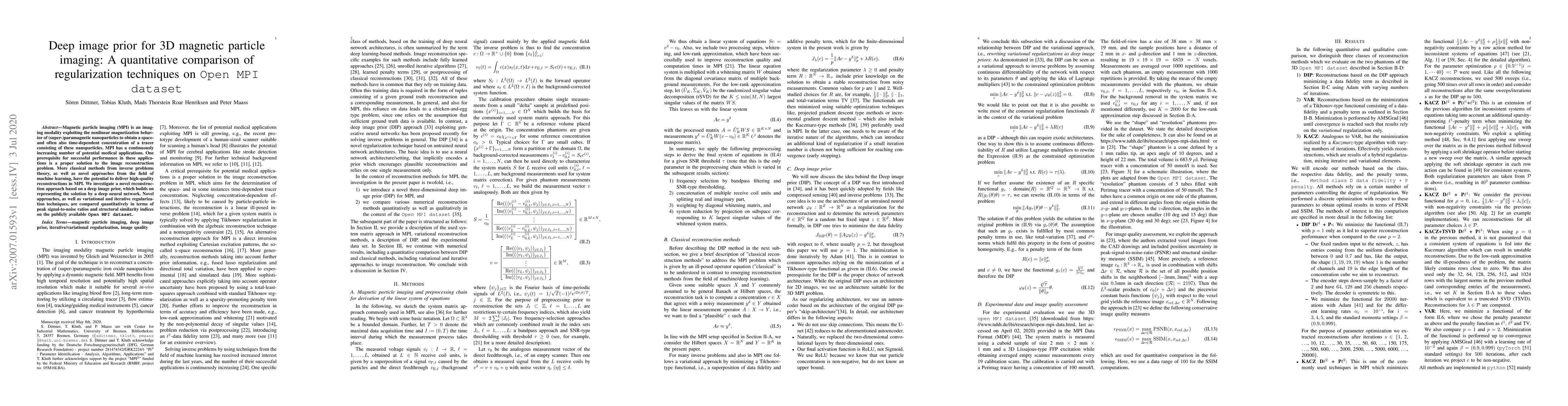 This paper investigates a deep image prior approach for reconstructing 3D magnetic particle imaging (MPI) data, comparing it with traditional regularization techniques. The study evaluates various methods quantitatively using peak signal-to-noise ratios and structural similarity indices on the Open MPI dataset.