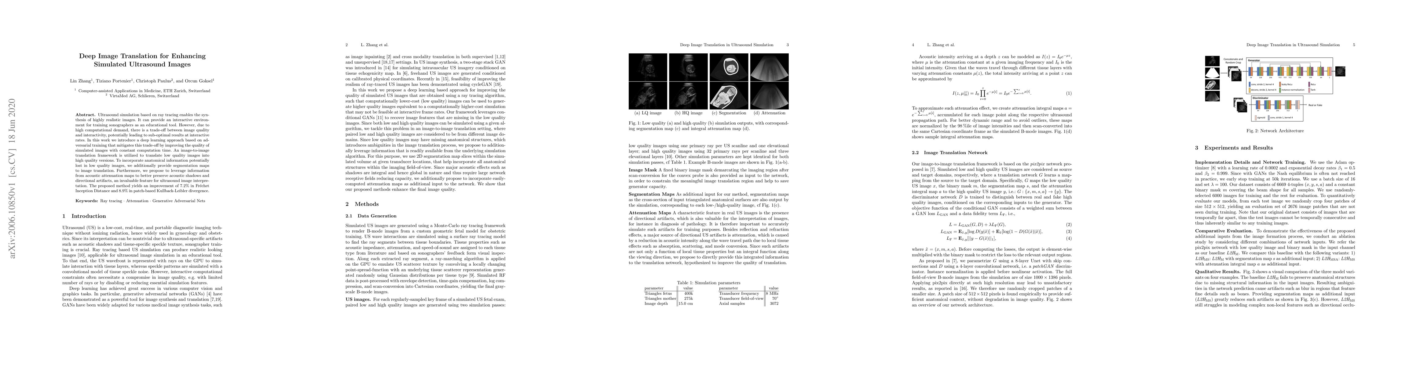 This paper proposes a deep learning method to enhance simulated ultrasound images using adversarial training and image-to-image translation, aiming to improve image quality while maintaining constant computation time. The approach incorporates segmentation maps and acoustic attenuation maps to preserve anatomical details and directional artifacts, achieving a 7.2% improvement in Fréchet Inception Distance and an 8.9% improvement in patch-based Kullback-Leibler divergence.