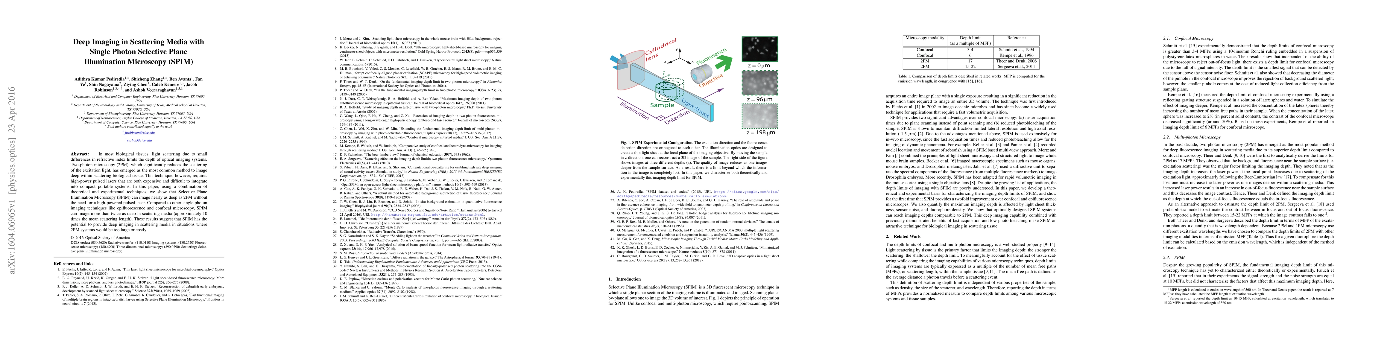This paper demonstrates that Selective Plane Illumination Microscopy (SPIM) can achieve deep imaging in scattering biological tissues nearly as effectively as two-photon microscopy (2PM), without requiring the high-powered pulsed lasers. SPIM offers more than double the imaging depth compared to single photon techniques like epifluorescence and confocal microscopy.
