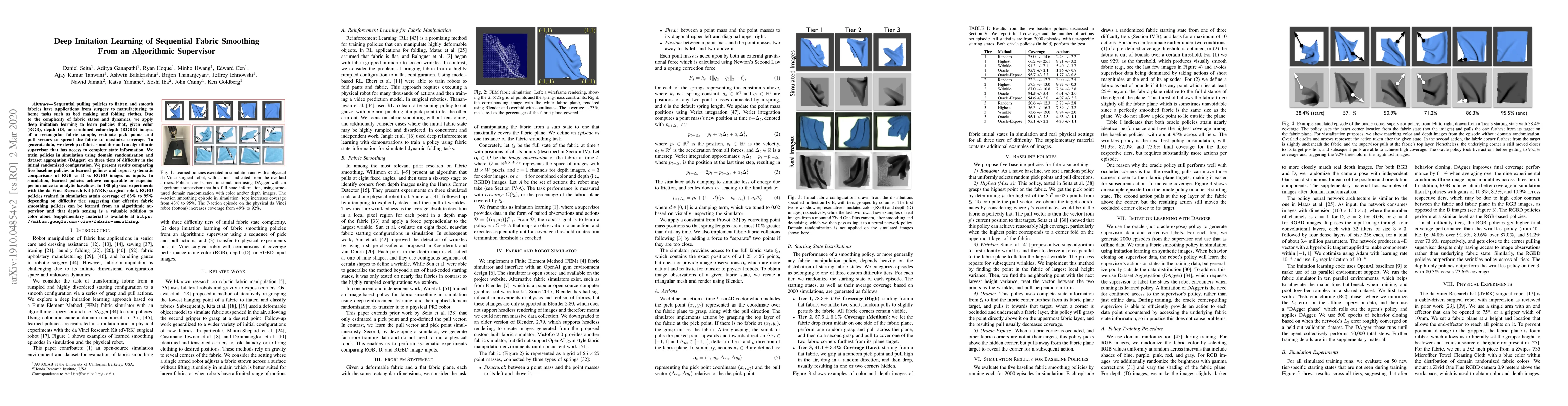 Researchers developed a deep imitation learning method to learn policies for smoothing fabrics using RGB, depth, or combined images, achieving comparable performance in simulation and physical experiments with the da Vinci Research Kit.