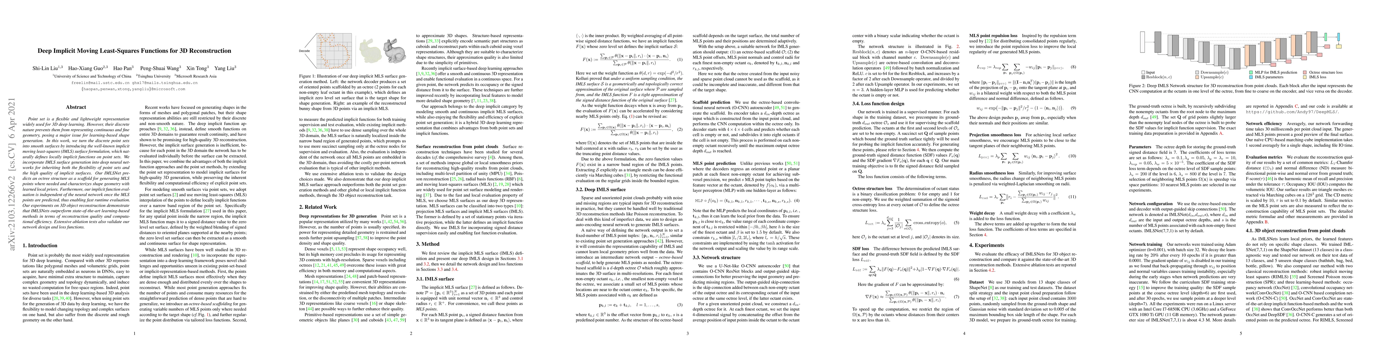 This paper proposes IMLSNet, a deep learning framework that integrates implicit moving least-squares (IMLS) surface generation into neural networks to reconstruct high-quality 3D shapes from discrete point sets, outperforming existing methods in reconstruction quality and efficiency. The method uses an octree to efficiently generate IMLS points and achieves fast evaluation independent of the neural network.
