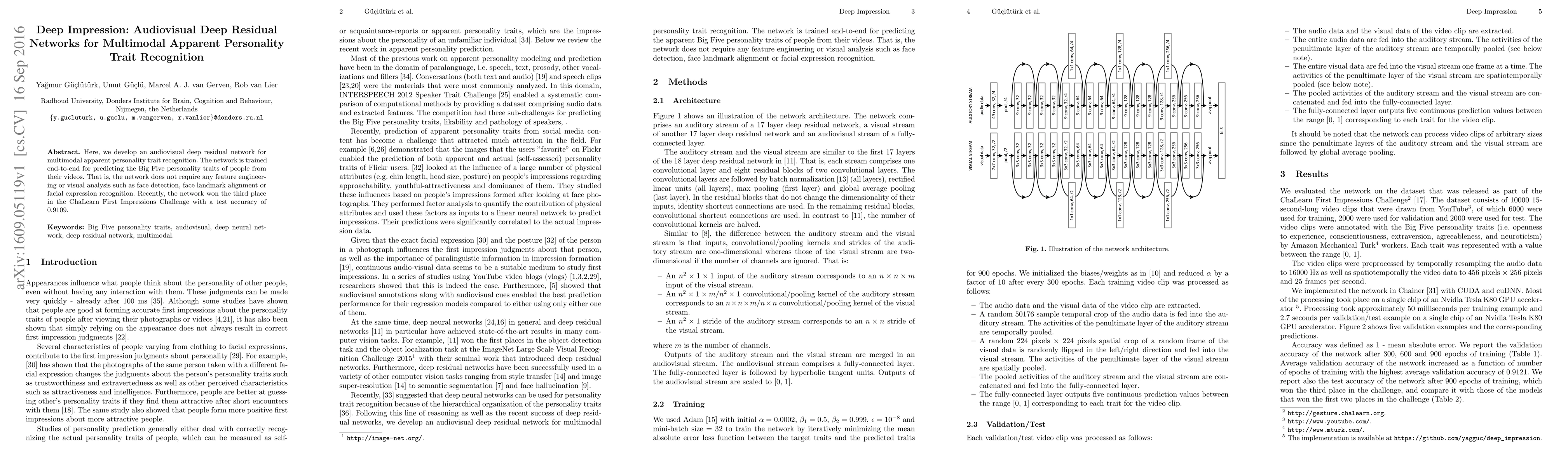 This paper introduces an audiovisual deep residual network for predicting the Big Five personality traits from video data, achieving high accuracy without requiring feature engineering or visual analysis. The network won third place in the ChaLearn First Impressions Challenge with a test accuracy of 0.9109.