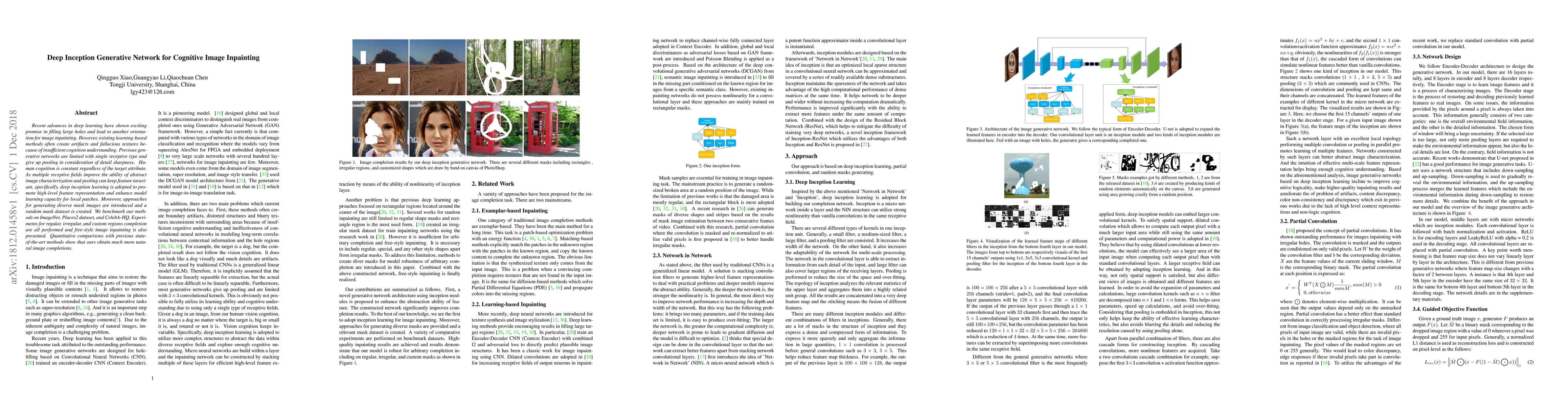 The paper proposes a Deep Inception Generative Network for cognitive image inpainting, utilizing multiple receptive fields and deep inception learning to enhance high-level feature representation and reduce artifacts. The method is benchmarked on ImageNet, Places2, and CelebA-HQ datasets, demonstrating superior performance in completing regular, irregular, and custom regions.