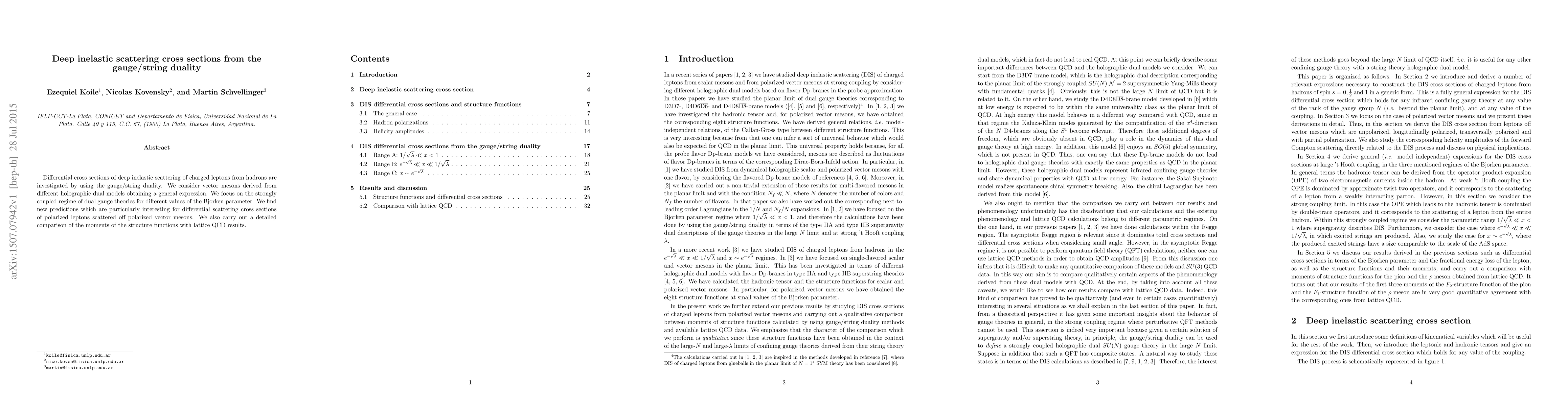 This paper investigates differential cross sections of deep inelastic scattering using gauge/string duality, focusing on the strongly coupled regime of dual gauge theories. It provides new predictions for polarized lepton-vector meson scattering and compares structure function moments with lattice QCD results.