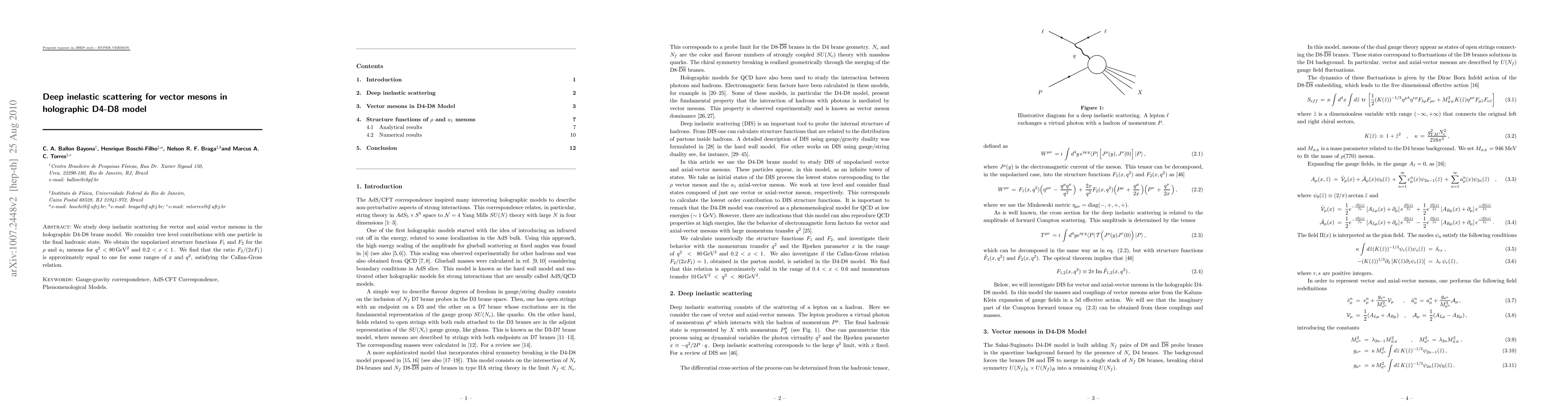 This study explores deep inelastic scattering of vector and axial vector mesons within a holographic D4-D8 brane model, deriving unpolarized structure functions F1 and F2 for rho and a1 mesons. The analysis reveals that the ratio F2/(2xF1) approximates one for certain ranges of x and q2, confirming the Callan-Gross relation.