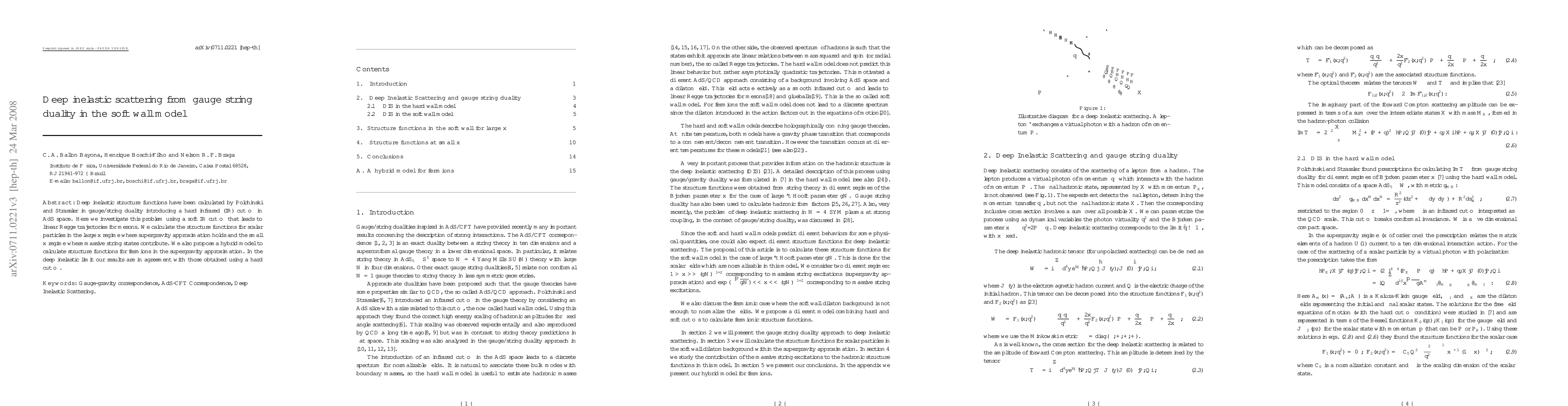 Deep inelastic structure functions have been calculated by Polchinski and Strassler in gauge/string duality introducing a hard infrared (IR) cut off in AdS space. Here we investigate this problem using a soft IR cut off that leads to linear Regge trajectories for mesons. We calculate the structure functions for scalar particles in the large x regime where supergravity approximation holds and the small x regime where massive string states contribute. We also propose a hybrid model to calculate structure functions for fermions in the supergravity approximation. In the deep inelastic limit our results are in agreement with those obtained using a hard cut off.