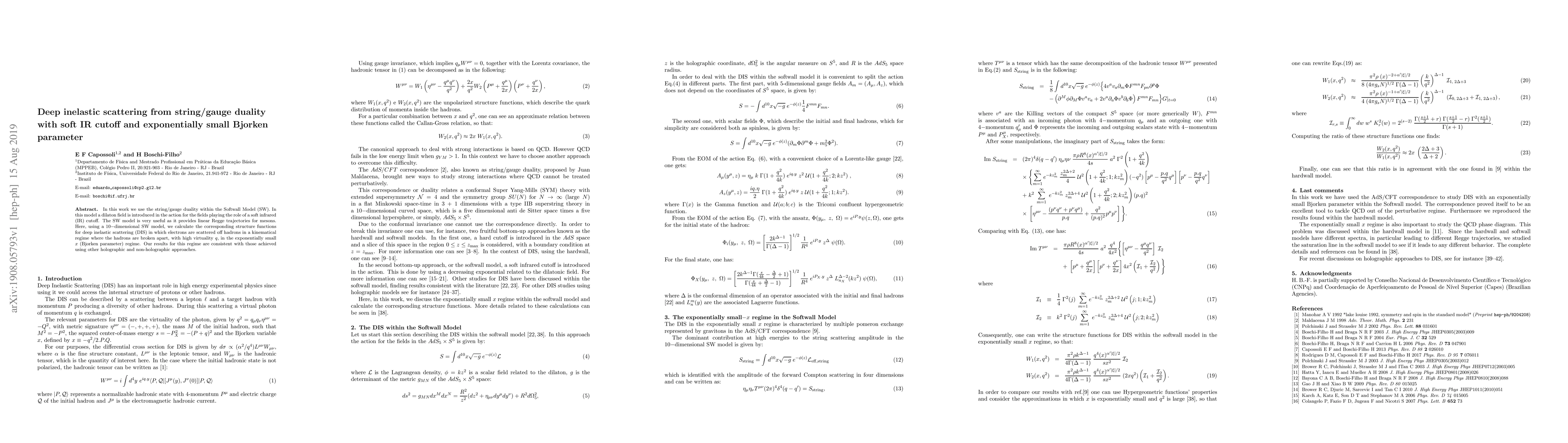 This research utilizes the Softwall Model in string/gauge duality to calculate structure functions for deep inelastic scattering in the regime of high virtuality and exponentially small Bjorken parameter, demonstrating consistency with other theoretical approaches. The model introduces a dilaton field acting as a soft infrared cutoff, providing linear Regge trajectories for mesons.