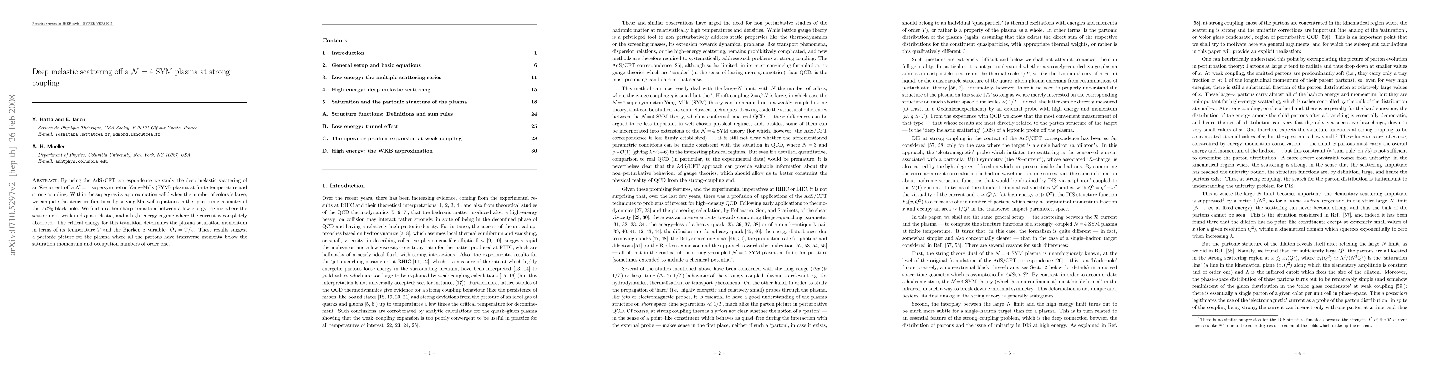This paper uses the AdS/CFT correspondence to study deep inelastic scattering of an R-current off a N=4 SYM plasma at strong coupling and finite temperature. The authors find a transition between weak, quasi-elastic scattering at low energies and complete absorption at high energies, determining the plasma saturation momentum as Q_s=T/x.