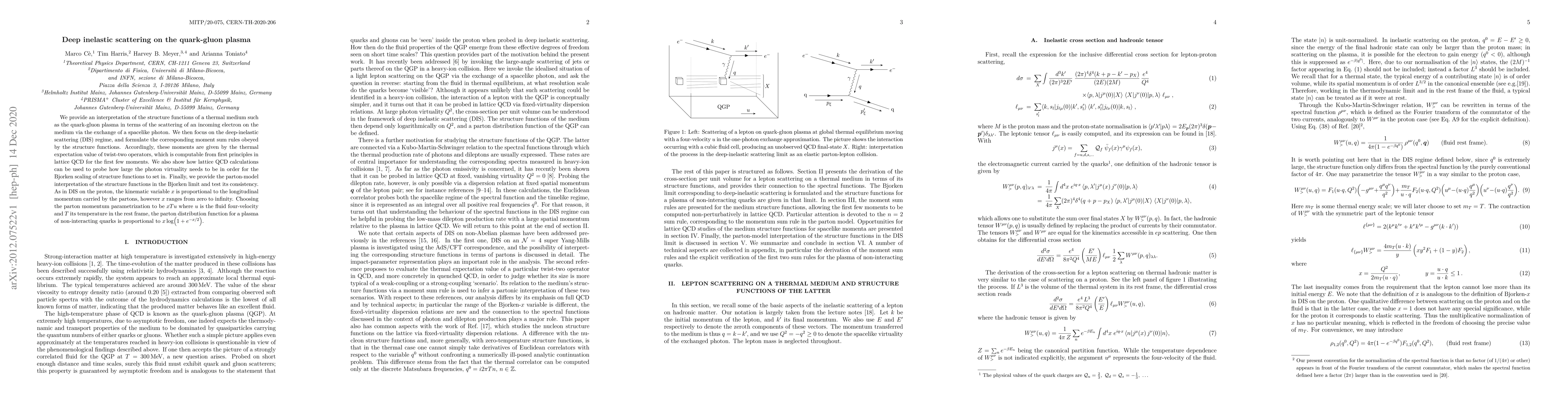 We provide an interpretation of the structure functions of a thermal medium such as the quark-gluon plasma in terms of the scattering of an incoming electron on the medium via the exchange of a spacelike photon. We then focus on the deep-inelastic scattering (DIS) regime, and formulate the corresponding moment sum rules obeyed by the structure functions. Accordingly, these moments are given by the thermal expectation value of twist-two operators, which is computable from first principles in lattice QCD for the first few moments. We also show how lattice QCD calculations can be used to probe how large the photon virtuality needs to be in order for the Bjorken scaling of structure functions to set in. Finally, we provide the parton-model interpretation of the structure functions in the Bjorken limit and test its consistency. As in DIS on the proton, the kinematic variable $x$ is proportional to the longitudinal momentum carried by the partons, however $x$ ranges from zero to infinity. Choosing the parton momentum parametrization to be $ x T u$ where $u$ is the fluid four-velocity and $T$ its temperature in the rest frame, the parton distribution function for a plasma of non-interacting quarks is proportional to $ x \log(1+e^{-x/2}) $.