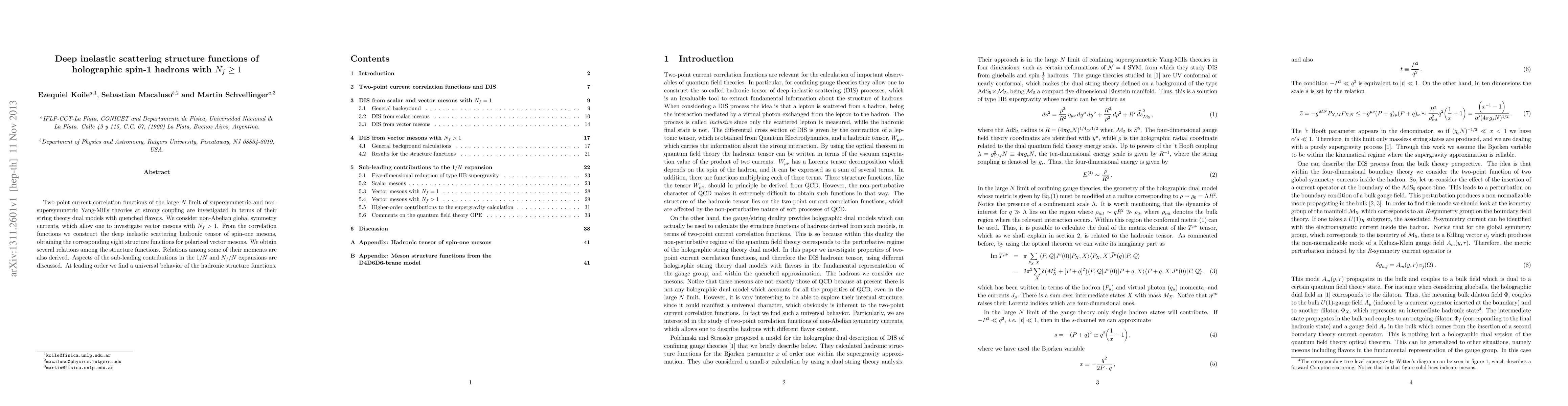 This paper investigates the deep inelastic scattering structure functions of holographic spin-1 hadrons with multiple flavors using string theory dual models. It derives relations among the eight structure functions for polarized vector mesons and discusses sub-leading contributions in the $1/N$ and $N_f/N$ expansions, revealing universal behavior at leading order.
