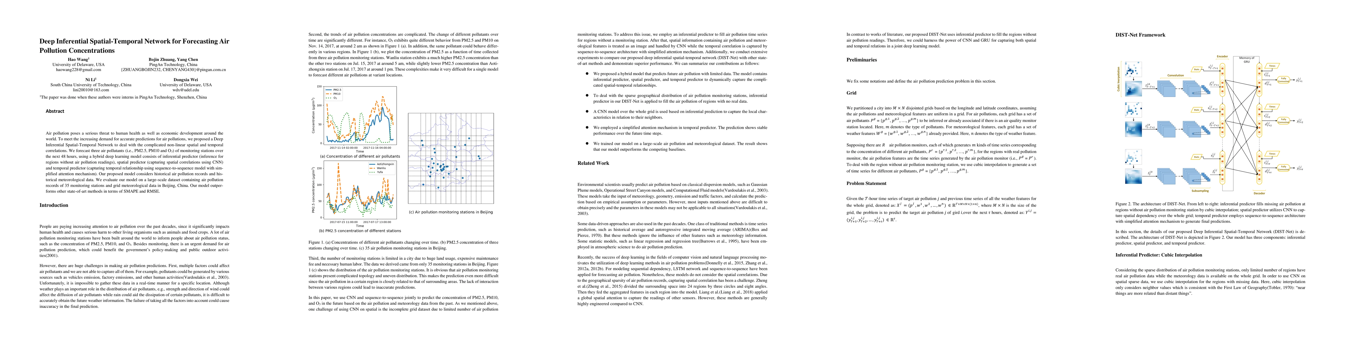 This paper proposes a Deep Inferential Spatial-Temporal Network for forecasting air pollution concentrations, combining inferential, spatial, and temporal predictors to handle non-linear correlations. The model outperforms other methods in predicting PM2.5, PM10, and O3 over the next 48 hours using historical data from Beijing, China.