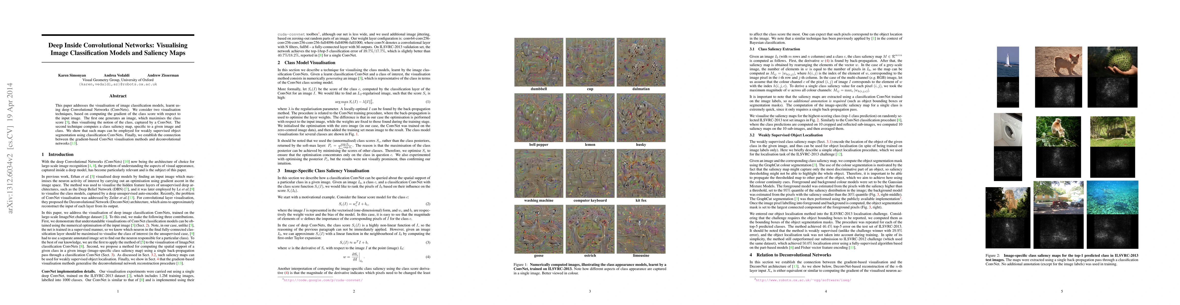 This paper explores visualisation techniques for deep Convolutional Networks used in image classification, employing gradient-based methods to generate class-maximising images and class saliency maps. It demonstrates the utility of saliency maps for weakly supervised object segmentation and links these visualisations to deconvolutional networks.