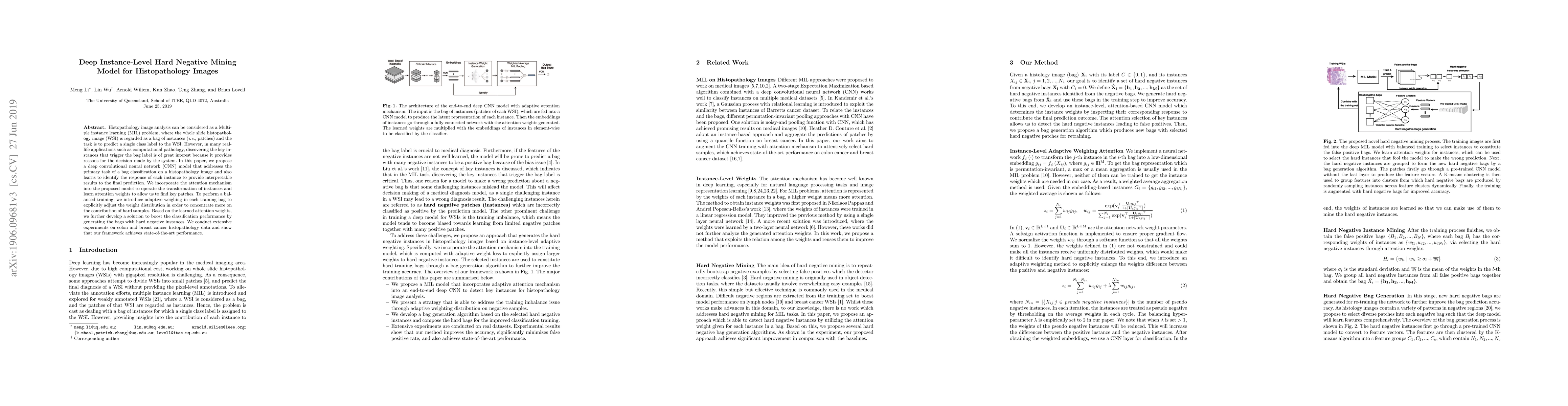 Histopathology image analysis can be considered as a Multiple instance learning (MIL) problem, where the whole slide histopathology image (WSI) is regarded as a bag of instances (i.e, patches) and the task is to predict a single class label to the WSI. However, in many real-life applications such as computational pathology, discovering the key instances that trigger the bag label is of great interest because it provides reasons for the decision made by the system. In this paper, we propose a deep convolutional neural network (CNN) model that addresses the primary task of a bag classification on a WSI and also learns to identify the response of each instance to provide interpretable results to the final prediction. We incorporate the attention mechanism into the proposed model to operate the transformation of instances and learn attention weights to allow us to find key patches. To perform a balanced training, we introduce adaptive weighing in each training bag to explicitly adjust the weight distribution in order to concentrate more on the contribution of hard samples. Based on the learned attention weights, we further develop a solution to boost the classification performance by generating the bags with hard negative instances. We conduct extensive experiments on colon and breast cancer histopathology data and show that our framework achieves state-of-the-art performance.
