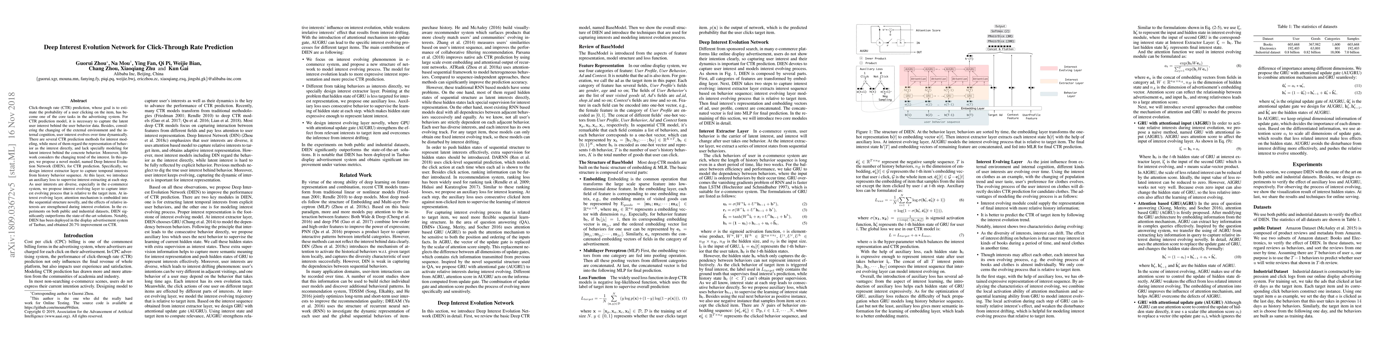 The paper introduces the Deep Interest Evolution Network (DIEN) for improving click-through rate (CTR) prediction by capturing dynamic user interests over time. DIEN utilizes an interest extractor layer and an interest evolving layer with an attention mechanism to model latent user interests and their temporal changes, significantly outperforming existing methods in experiments.