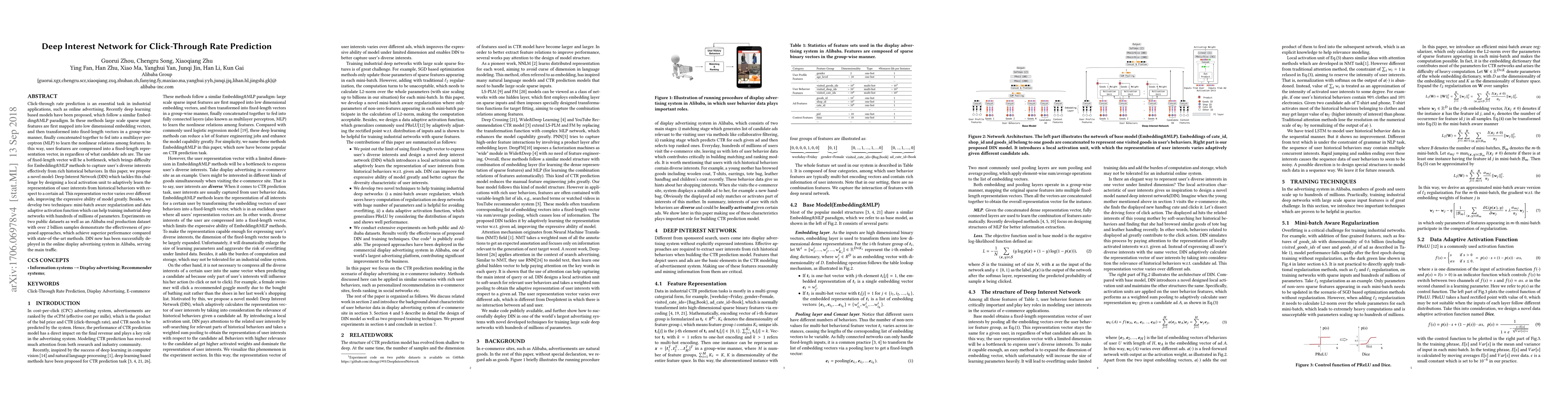 The Deep Interest Network (DIN) model proposes an adaptive representation learning method to enhance click-through rate prediction by dynamically generating variable-length interest vectors for users based on historical behaviors relative to specific ads. This approach, along with mini-batch aware regularization and data adaptive activation function, outperforms existing methods on public and Alibaba datasets.