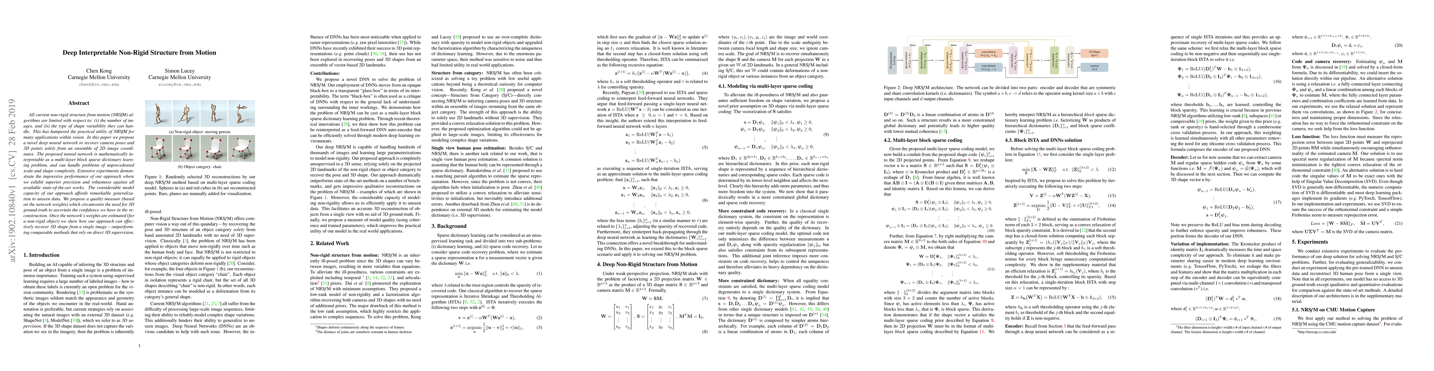 All current non-rigid structure from motion (NRSfM) algorithms are limited with respect to: (i) the number of images, and (ii) the type of shape variability they can handle. This has hampered the practical utility of NRSfM for many applications within vision. In this paper we propose a novel deep neural network to recover camera poses and 3D points solely from an ensemble of 2D image coordinates. The proposed neural network is mathematically interpretable as a multi-layer block sparse dictionary learning problem, and can handle problems of unprecedented scale and shape complexity. Extensive experiments demonstrate the impressive performance of our approach where we exhibit superior precision and robustness against all available state-of-the-art works. The considerable model capacity of our approach affords remarkable generalization to unseen data. We propose a quality measure (based on the network weights) which circumvents the need for 3D ground-truth to ascertain the confidence we have in the reconstruction. Once the network's weights are estimated (for a non-rigid object) we show how our approach can effectively recover 3D shape from a single image -- outperforming comparable methods that rely on direct 3D supervision.