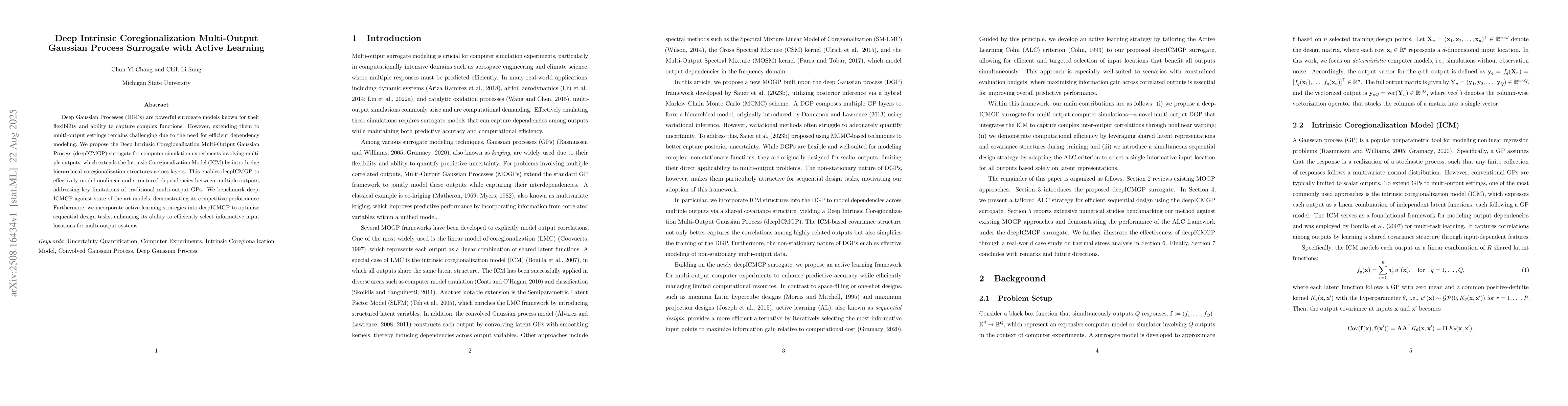 Deep Gaussian Processes (DGPs) are powerful surrogate models known for their flexibility and ability to capture complex functions. However, extending them to multi-output settings remains challenging due to the need for efficient dependency modeling. We propose the Deep Intrinsic Coregionalization Multi-Output Gaussian Process (deepICMGP) surrogate for computer simulation experiments involving multiple outputs, which extends the Intrinsic Coregionalization Model (ICM) by introducing hierarchical coregionalization structures across layers. This enables deepICMGP to effectively model nonlinear and structured dependencies between multiple outputs, addressing key limitations of traditional multi-output GPs. We benchmark deepICMGP against state-of-the-art models, demonstrating its competitive performance. Furthermore, we incorporate active learning strategies into deepICMGP to optimize sequential design tasks, enhancing its ability to efficiently select informative input locations for multi-output systems.