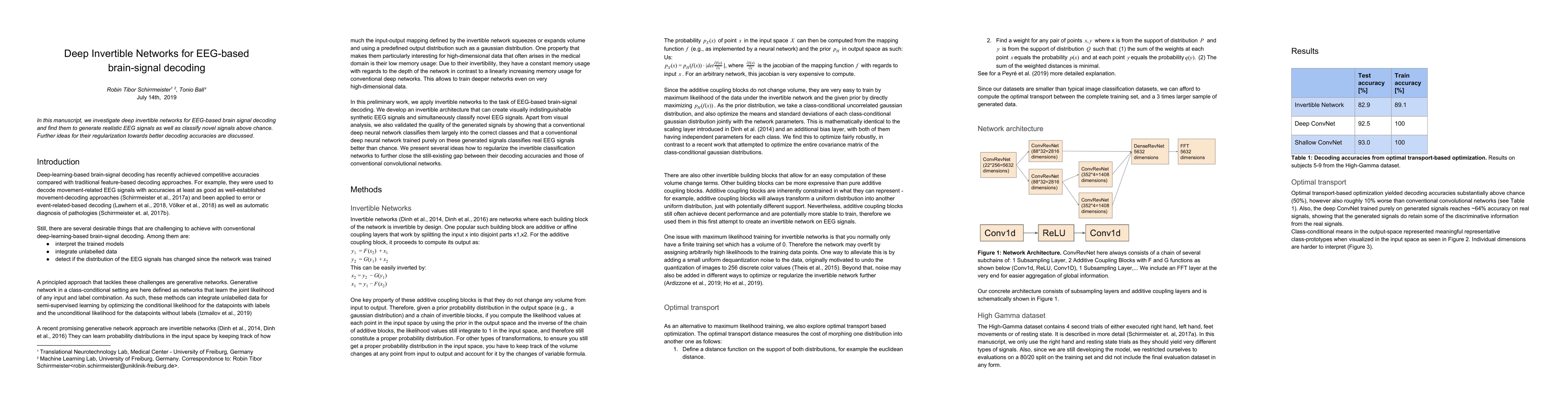 Summary: This paper explores deep invertible networks for decoding EEG brain signals, demonstrating their ability to generate realistic EEG data and classify novel signals effectively. The study also proposes regularization techniques to improve decoding accuracy.