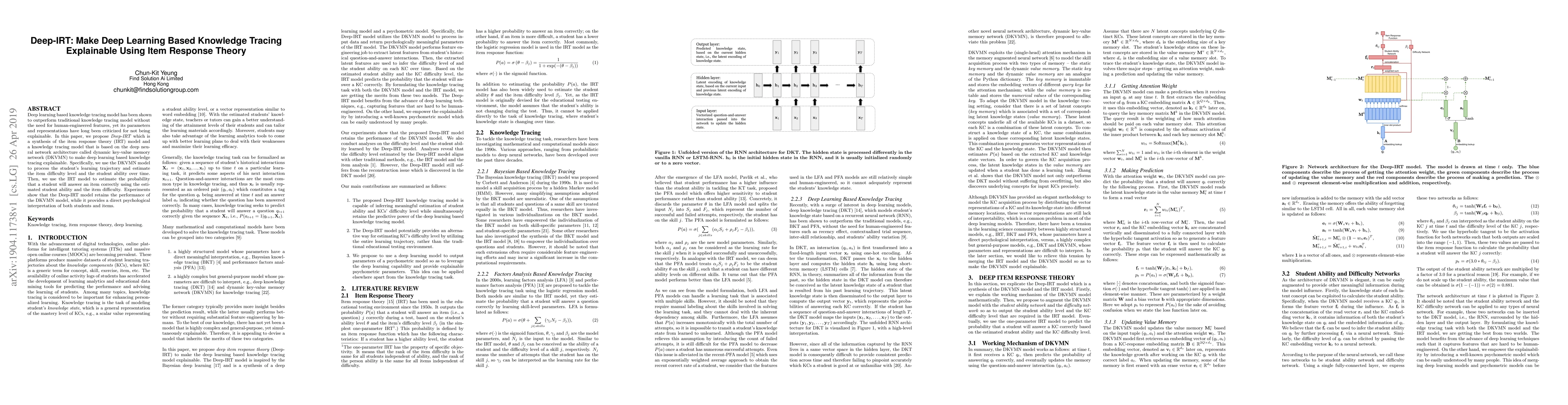 This paper proposes Deep-IRT, a model that combines item response theory (IRT) with a dynamic key-value memory network (DKVMN) to make deep learning-based knowledge tracing explainable. The DKVMN estimates student ability and item difficulty, while IRT provides a psychological interpretation, maintaining performance while enhancing interpretability.