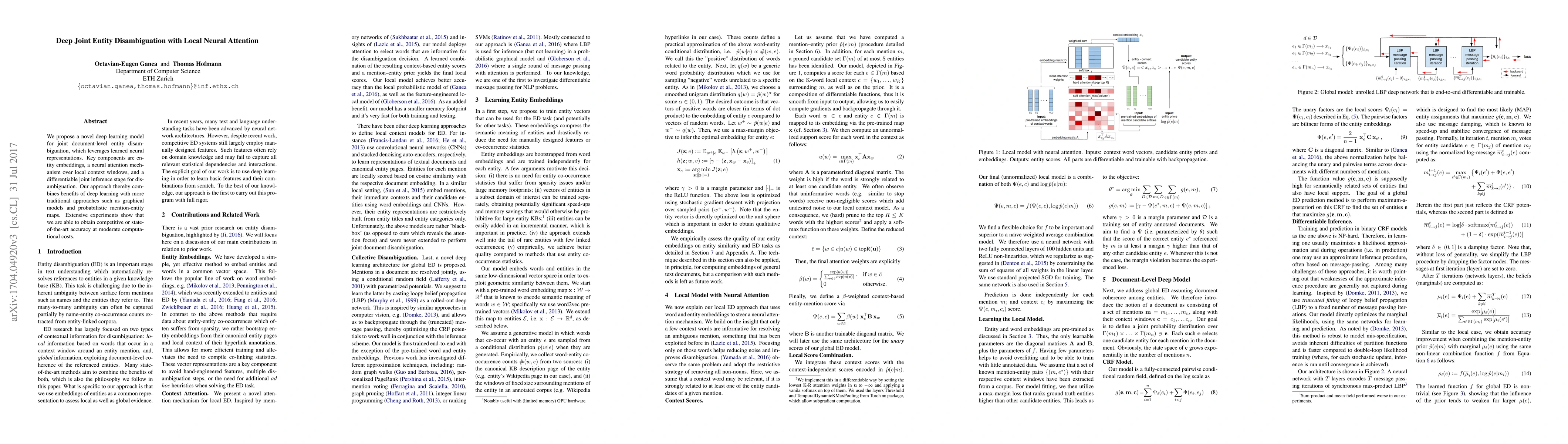 This paper introduces a deep learning model for joint entity disambiguation using neural attention over local context, achieving competitive accuracy with moderate computational costs. The model combines neural representations and traditional probabilistic methods for improved disambiguation.