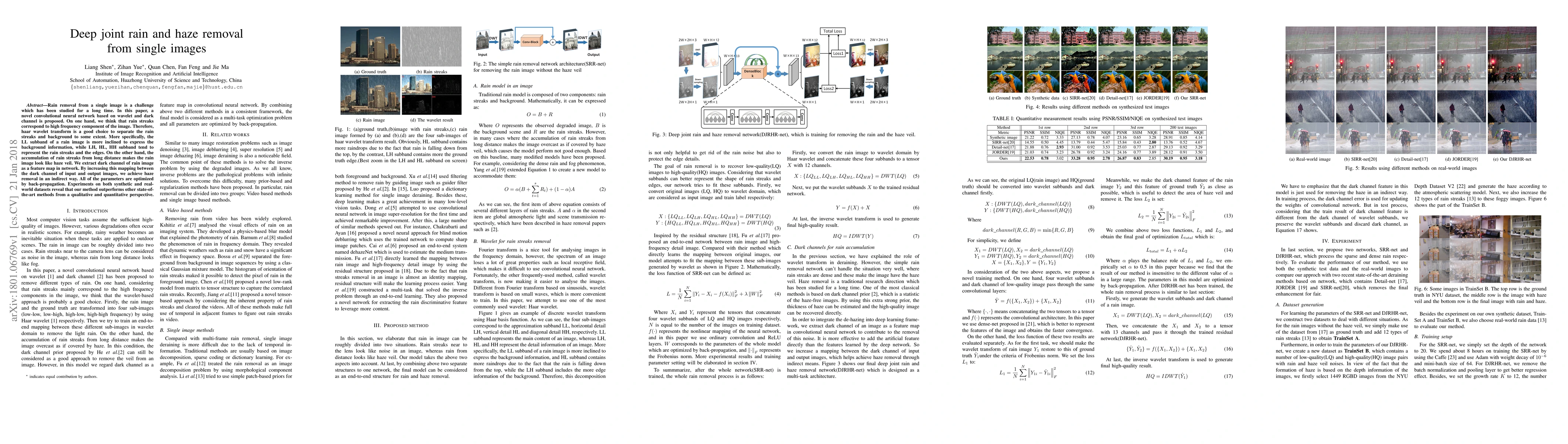 A novel convolutional neural network based on wavelet and dark channel is proposed for joint rain and haze removal from single images. The method separates rain streaks (high-frequency components) using Haar wavelet transform and incorporates dark channel features to remove haze indirectly.